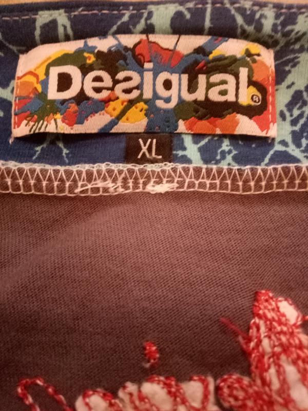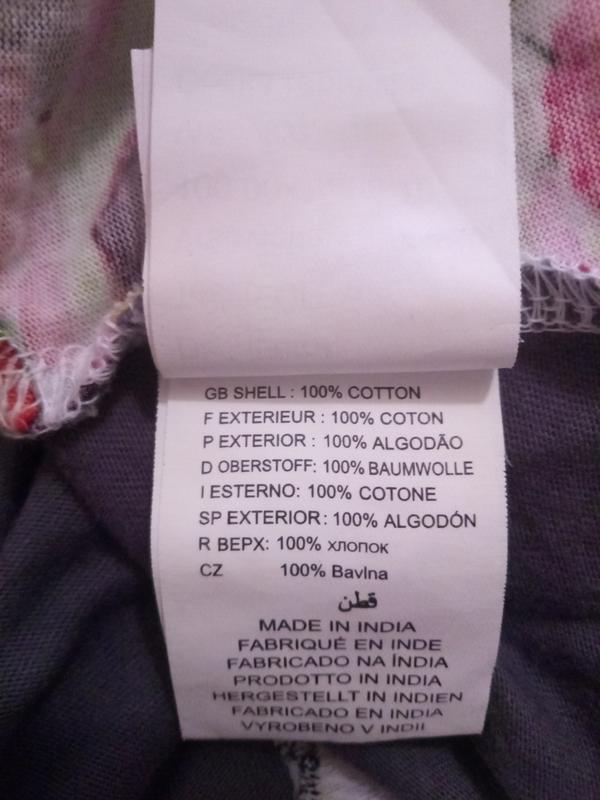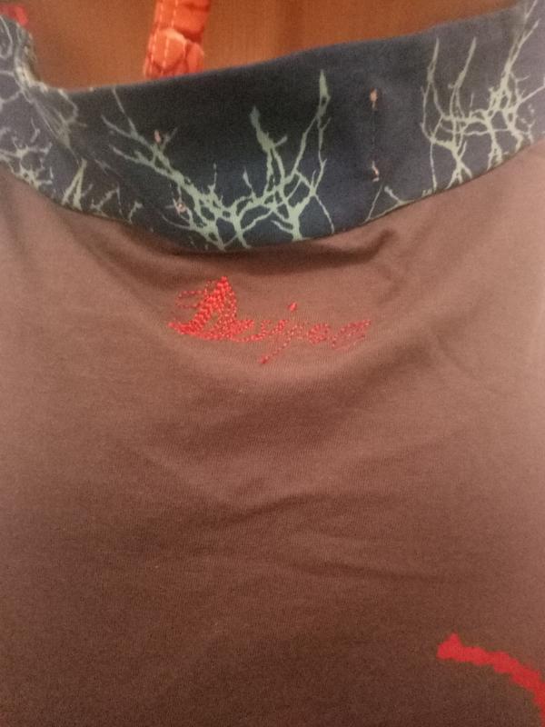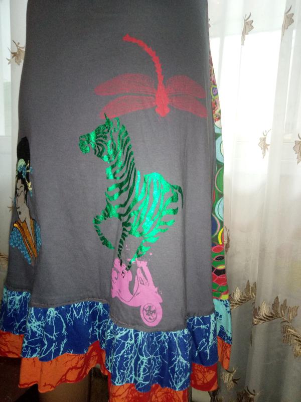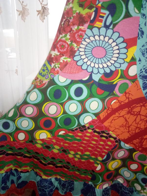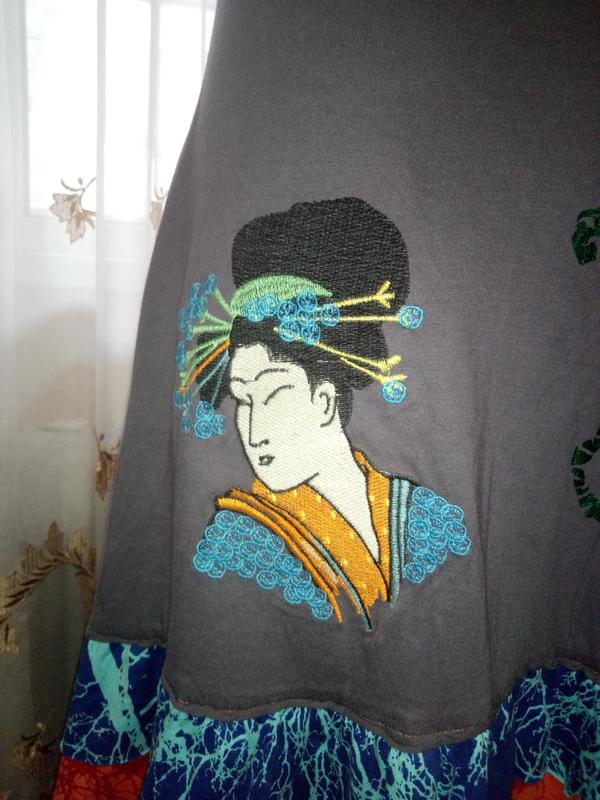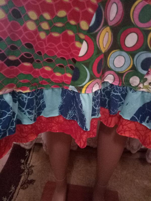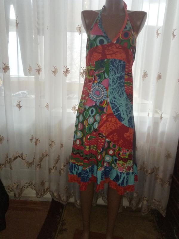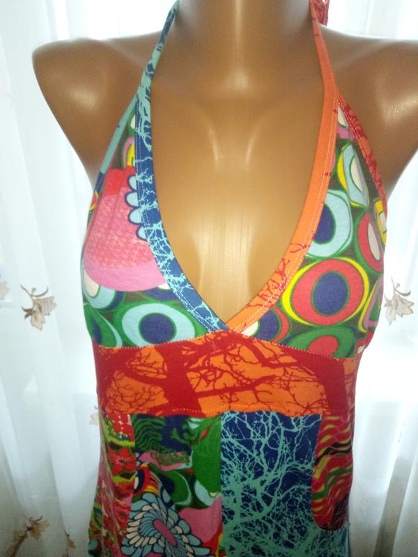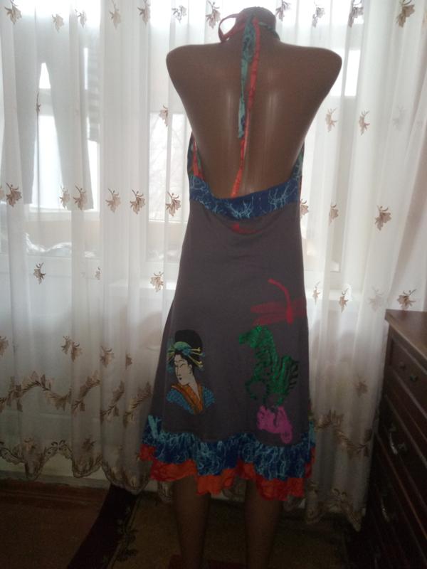 трикотажный сарафан в очень яркий разнообразный принт, V-образный вырез горловины, без рукавов, по нижнему краю несколько воланов, завязывается поворозками на шее, открытая спинка, сзади несколько вышивок (фирменная надпись, девушка-японка, стрекоза), аппликации, длина до колен