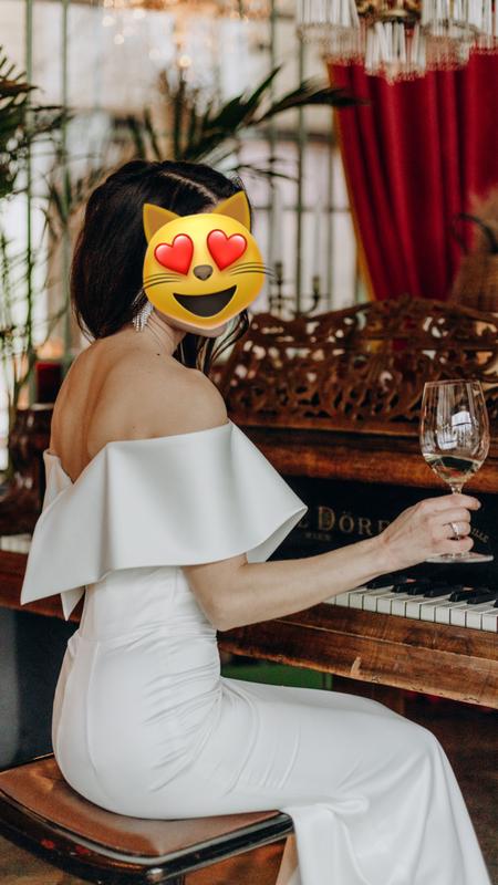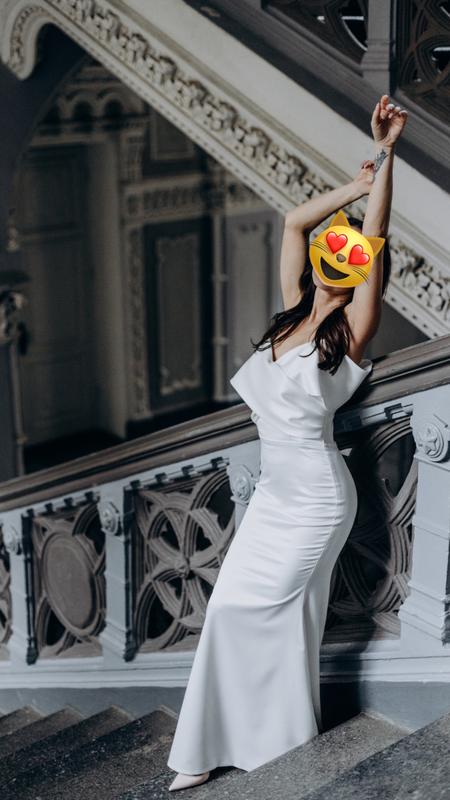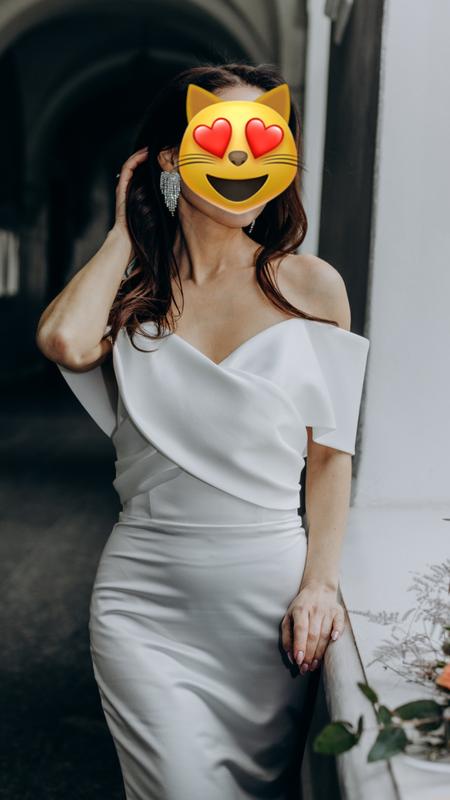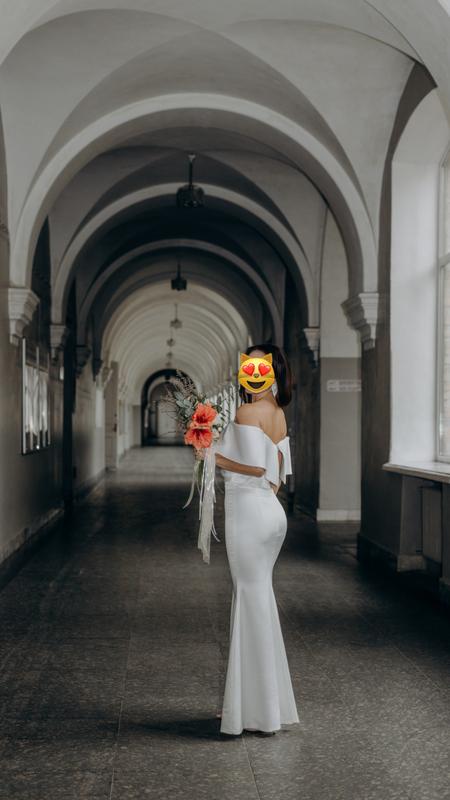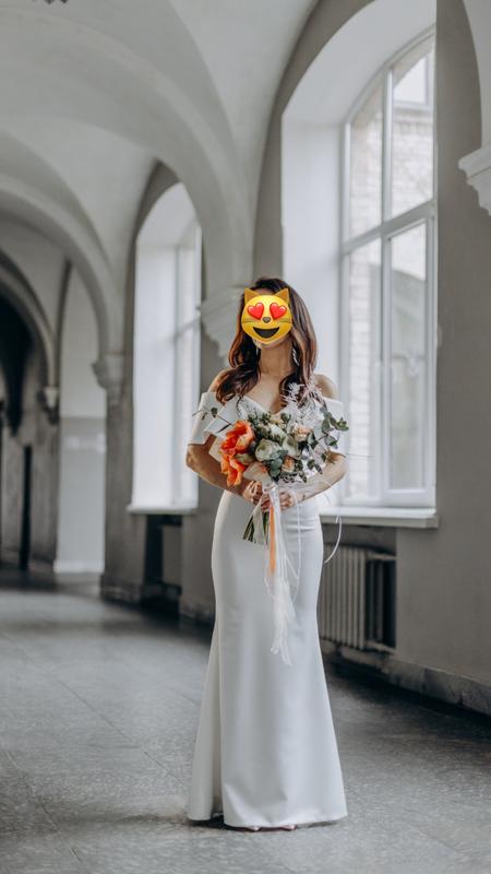 Весільна сукня українського виробництва у класичному стилі з відкритими плечима моделі «рибка». Ідеально сідає по фігурі, підкреслюючи іі, ззаду застібається на блискавку. Має знімні чашки з невеличким пушапом.