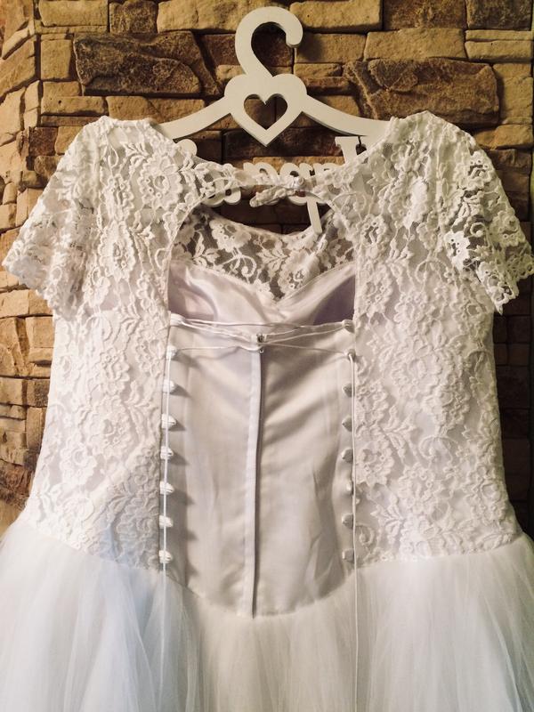 Сукня пошита на замовлення в 2019 році, зручна та легка,корсет регулюється та добре тримає, не вінчана. Після хімчистки. Пишна, фатін+мереживо, білого кольору. Розмір 60 Зріст 158 + каблук 6 см ОГ - 120, ВІД - 110 ПРО - 120 Реальна ціна 4500 торг можливий