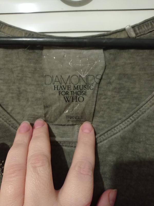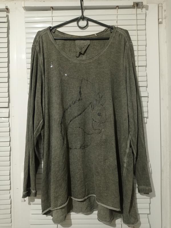 Дуже гарна, тоненька і приємна до тіла туніка, бірку зрізано, але на дотик дуже схоже, що натуральна тканина, тягнеться. Прикрашена принтом та стразиками, які яскраво виблискують та всі на місці. НОГ 69, НОС 72, довжина спереду 73, позаду 79