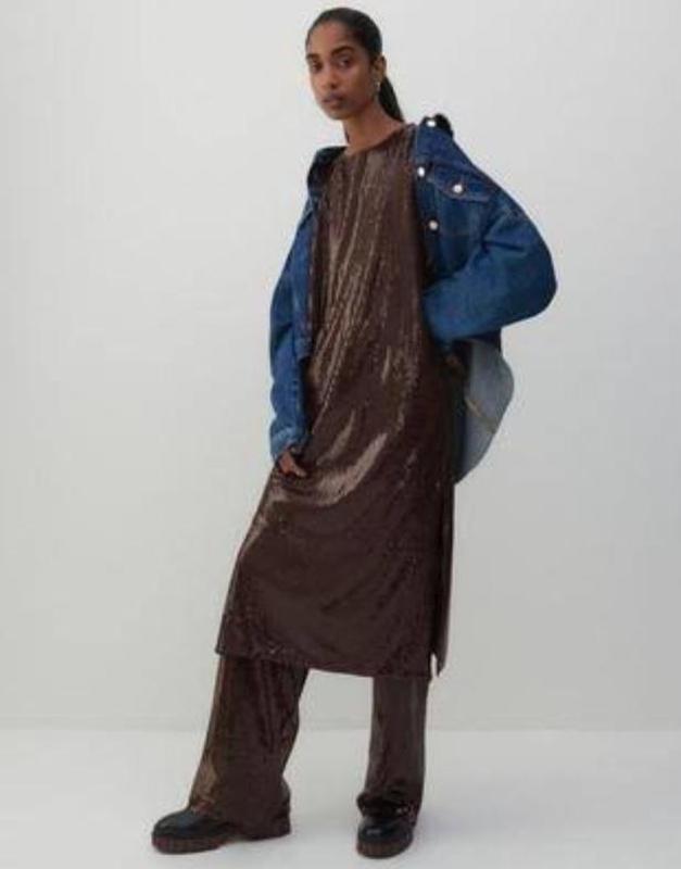 Сукня міді Reserved в пайєтки. Розмір на бірці L. На підкладці. На спинці V-подібний виріз. Розрізи по боках. Сукня якісна, пайєтки пришиті. ПОГ 51 см ПОТ 52 см ПОС 54 см Довжина 119 см Розрізи знизу з боків по 40 см Тканина тягнеться.
