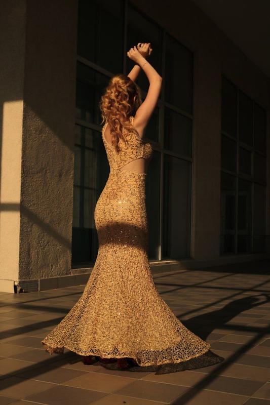 Продається вечірня сукня фасону “рибка”, одягнена лише один раз на випускний. Тілесно-золотистий колір і блискуче оздоблення з паєток чудово підкреслюють фігуру та додають елегантності образу. Верх виконаний із напівпрозорого матеріалу, що додає ніжності. Сукня підходить на зріст 165-169 см і розмір S. Купувалася за 9000 грн, стан ідеальний, без пошкоджень. Ідеальний варіант для урочистої події або вечірнього виходу! Можливо торг