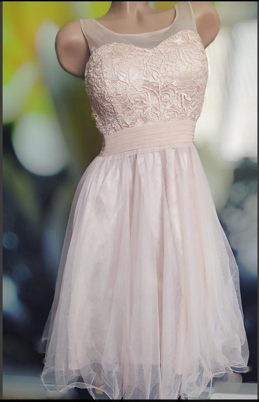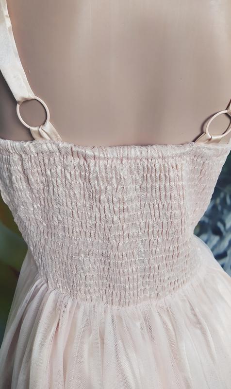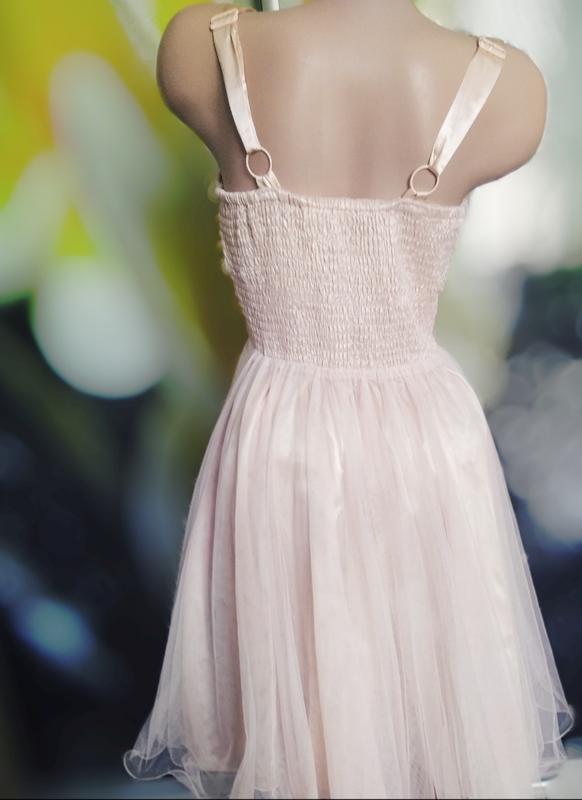 Шикарное вечернее платье пудрового цвета с шифоновой пышной юбкой клёш и вставкой из сеточки,верх атлас с кружевом,подойдёт для любого праздника.На спинке полностью вставка из гофрированной резинки,что позволяет регулировать размер.Размер указан М,но можно носить и на Л ,ХЛ,просто будет больше в обтяжечку.Платье состояние нового,одевалось один раз на свадьбу дружкой.Длина 91,от верхній части резинки до низа 61