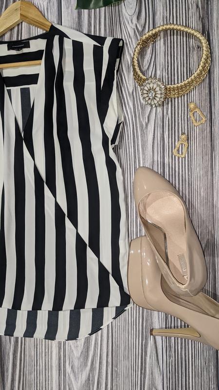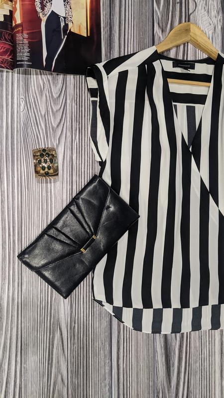 Неймовірна блуза в смужку.Крій назапах. Знизу заокруглена. Сидить вільно. Тканина шифонова, не просвічується,не тягнеться,тонка.
