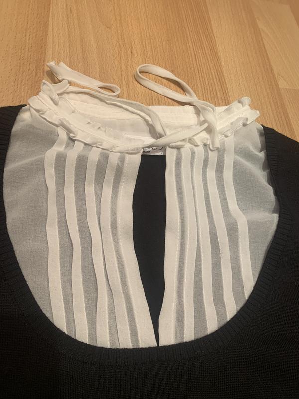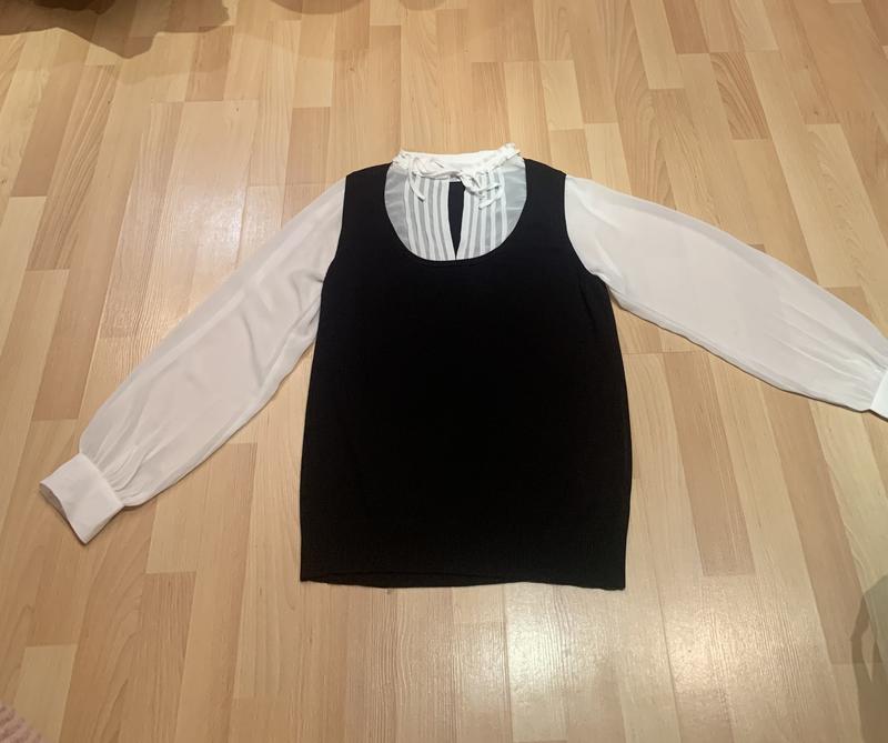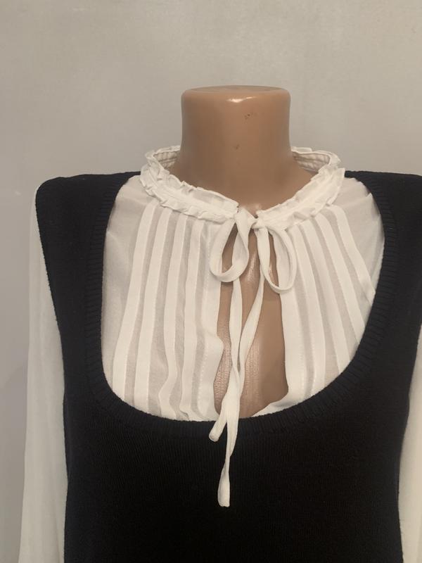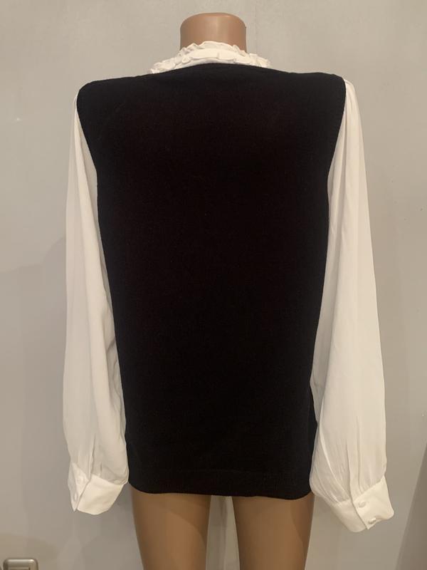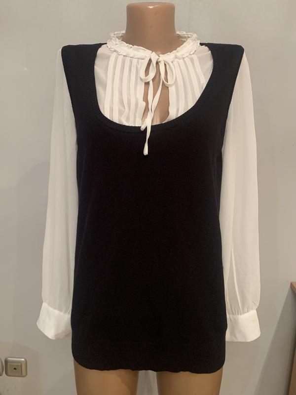 Элегантная комбинированая блузка с жилетом, яркая, стильная, рукав шифоновый, трикотаж жилетки вискоза.Красивый пышный рукав на манжете. Качественный бренд. Хорошо растягивается. Пог, ПО низа 50-55 см,длина 65 см, длина рукааа 63см.