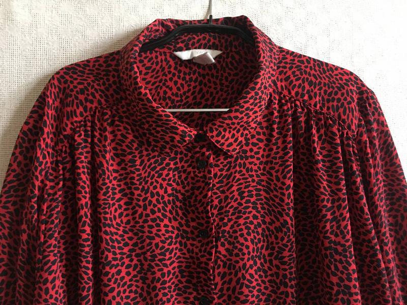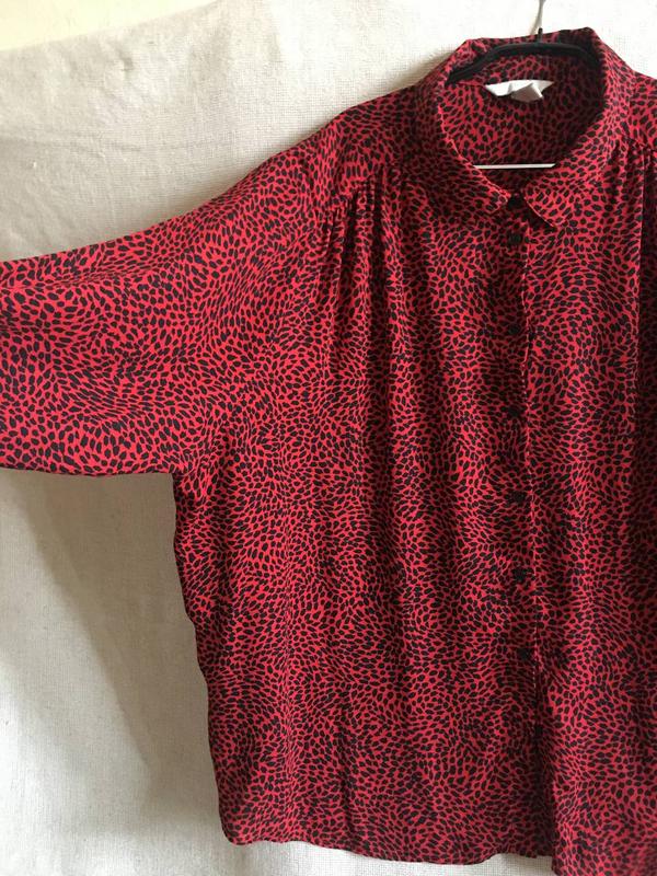 Основний колір темний червоний,принт чорного кольору.Тканина легка, не просвічується, не мнеться, гарно лежить.Рукави широкі, зручні.