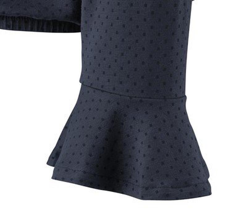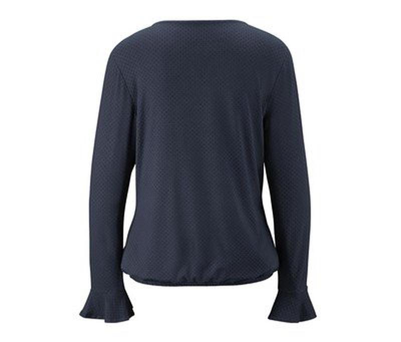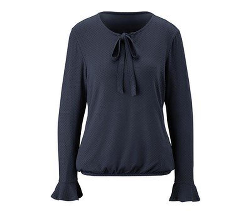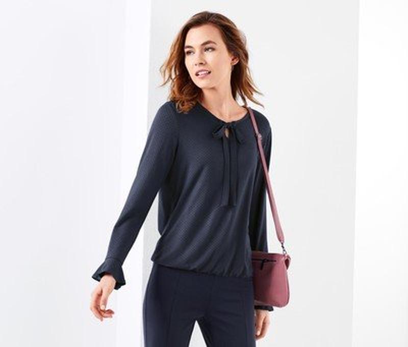 Блузы, подобные этой блузке с воланами, идеально подходят как для офисной одежды, так и для стильной повседневной одежды. Он изготовлен из мягкого плавного вискозного стрейчевого материала, имеет круглый вырез с завязкой и эластичный низ для идеальной подгонки. Кроме того, Elasthan обеспечивает стабильность размеров, идеальную посадку и высокий комфорт при ношении. Особый образ придают встроенные воланы на манжетах, минимальный тональный принт и декоративная металлическая пластина на подоле.