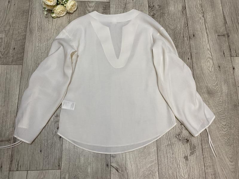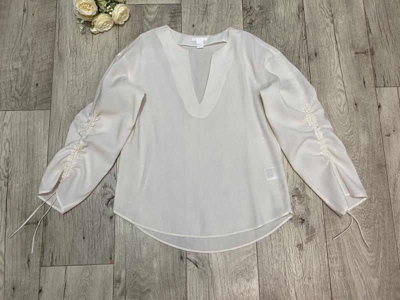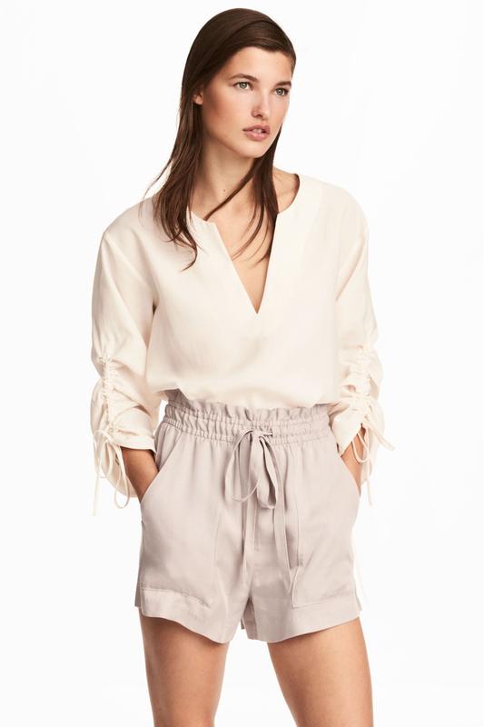 Блуза з драпіруванням H&MСклад: 86% ліоцел, 14% поліестерРозмір: S-MЗаміри:* плечі — спущені, 52 см,* ПОГ — 48 см,* довжина спереду — 65 см,* довжина ззаду — 69 см,* рукав від плеча в розпущеному стані — 55,5