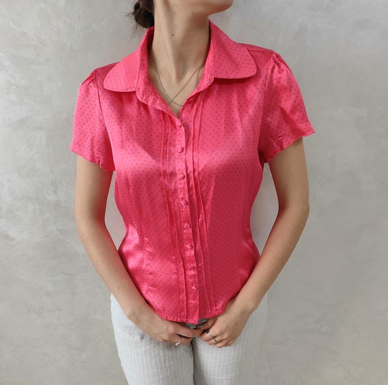 Стильна шовкова блуза від якісного нідерландського бренду Silver Creek. Виготовлена вона з високоякісного 100% атласного шовку: легкий, тонкий, при цьому достатньо цупкий, неймовірно ніжний та приємний до тіла, з красивим глянцевим фінішем. Блуза має базовий злегка приталений крій, навіть дещо нагадує піжамний стиль. Для даної речі підібрали соковитий "pig pink" відтінок і дрібний помаранчевий горошок. Дуже цікава й акцента річ, яка стане родзинкою вашого образу. Для прикладу прикріпляю офіційний сайт бренду (подібна блуза на ньому вартуватиме близько 50-70 євро) -********************************************************************************************** Розмір:на бірці вказаний розмір М, та гарно сяде і на менші розміри. Орієнтуйтесь на заміри. Заміри: ПОГ – 48 см, ПОТ - 41 см, низ – 49 см, довжина – 59 см, плечі – 37 см, довжина рукава - 17 см, ширина рукава - 32 см. Склад: 100% натуральний шовк. Параметри моделі: ОГ - 84 см, ОТ - 68 см, ОБ - 96 см. Зріст - 170 см.