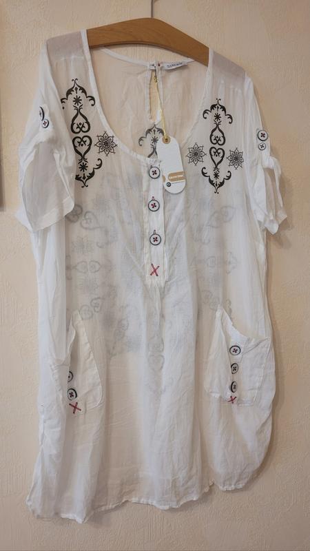 Нова неймовірно тонка та легенька блуза/туніка турецькаго бренду Darkwin. Знахідка на літні спекотні дні. Чудовий принт та чудові декоровані гудзики ( див. фото). Є дві робочі кишені. Низ рукав підстібається на гудзик ( можна регулювати довжину). Дуже стильно виглядає наживу, фото не передає краси. Гарно виглядає якщо вільно по фігурі. Склад: 100% котон, невагома тканина та схожа на ніжний паплін, трохи світиться. Колір: білий, принт: чорний Розмір: на етикетці XXL,, але краще див. заміри. Заміри: довжина від плеча прибл 86 см, ПОГ 64 см, довжина рукава 19 см, по рукава 21 см, від пройми до верха плеча 29 см, мах 31 см. Відправка Новою, Укрпоштою тільки після 100 % оплати на банківську картку