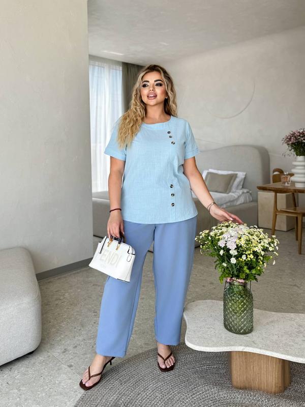 Стильна повсякденна літня блуза арт. dol. 242 Розмір: 46-48, 50-52, 54-56 Тканина: льон жатка Тканина натуральна, легка, м'яка, не просвічує. Вироби з даної тканини завжди виглядатимуть акуратно та красиво. Колір: білий, бежевий, лавандовий, зелений, голубий