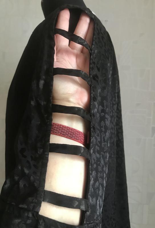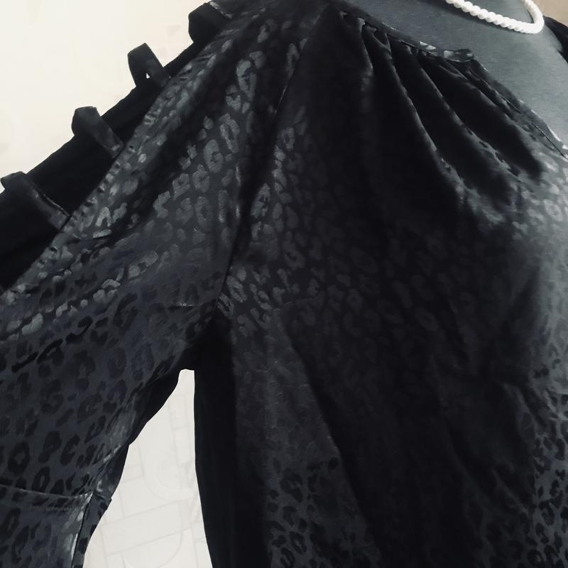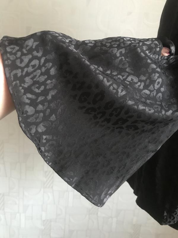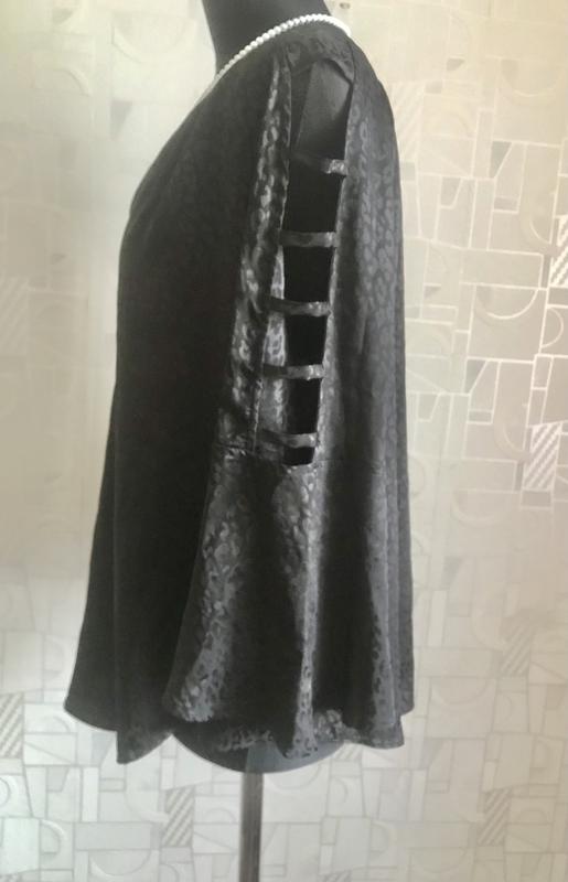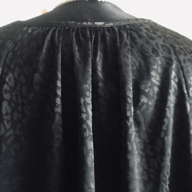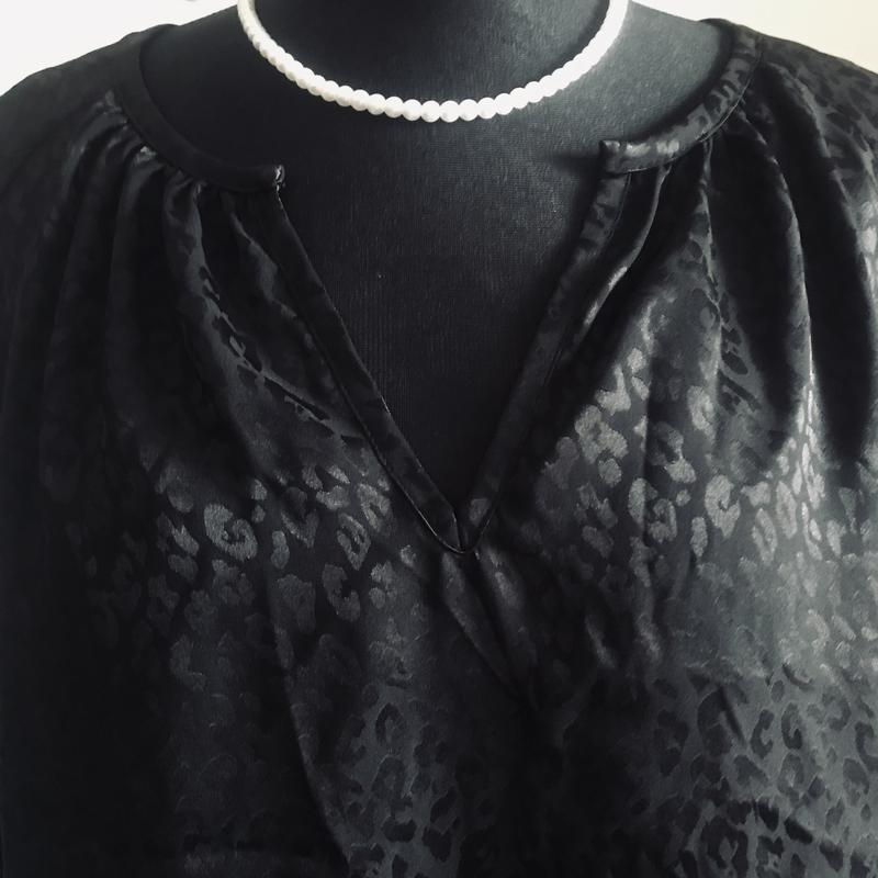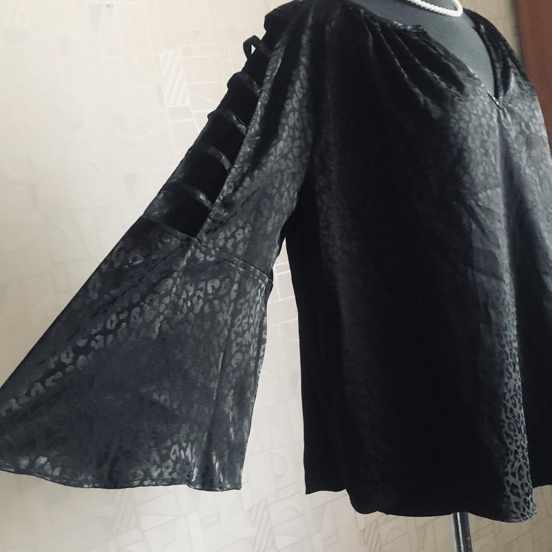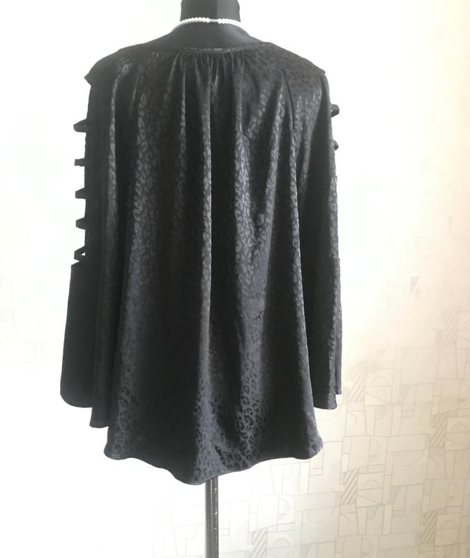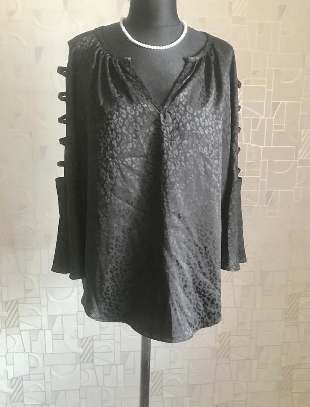 Брендова блузка чорного кольору, принт має блиск, тканина ніжна, шовковиста, рукав реглан цікавого фасону, низ заокруглений, стан і фасон максимально показано на фото, розмір указано L, завдяки призібраності піде на інші, орієнтуйтеся по замірах. Заміри: довж -60-63, пог під проймами-57, пог-57, пот-59, по стегон-61, довж рукава від вирізу-56, волан-19, по рукава по реглану-26, , злегка тягнеться, заміри зроблено в спокійному стані, якщо якийсь важливий переміряю , повернення немає, відповім на всі питання, відправлю зручною вам поштою після оплати на карту Приват чи Моно,читайте в розділі « про мене «, безпечна оплатою і накладний платіж з передплатою тільки Новою поштою чи Містекспрес
