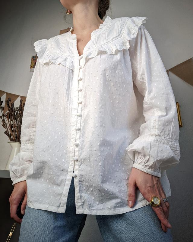 Блузка у вінтажному стилі з рюшами, оборками та мереживом, дуже мила з бавовни на ґудзиках виміри: довжина 67 см грудь 63.5 см плечі 44 см рукав 60 см