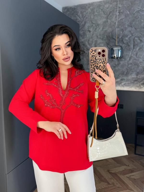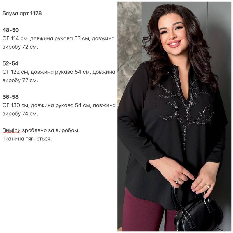 БлузаАрт 1178(хар) Тканина трикотаж креп дайвінг, оздоблення термокамінняКолір чорний, білий, червонийРозмір 48-50,52-54,56-58