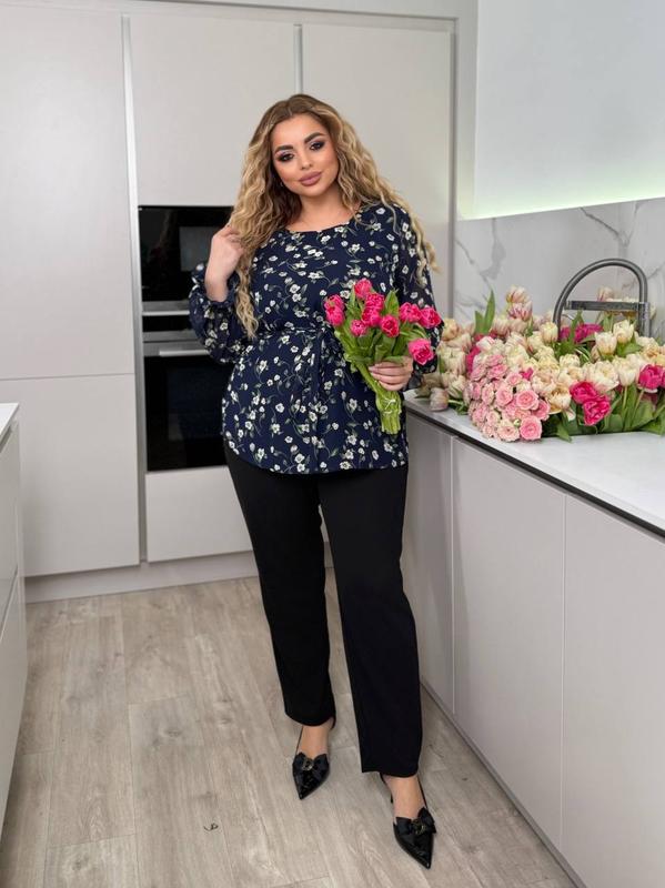Блузка вільного фасону, знизу підкладка, завдяки чому не буде нічого просвічуватись. Поясок з цієї ж тканини в комплекті та блуза гарно сидить і без ремінця.