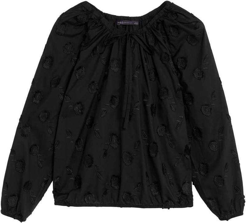 Безпечною оплатою не відправляю! Повна оплата на карту! Стан ідеальний, як новий! Ця блуза з чистої бавовни — це свіжий погляд на стиль бохо. Виріб звичайного крою має високу горловину із застібкою на зав’язку та класичні довгі рукави. Він усипаний вишитими квітковими аплікаціями для створення романтичного відчуття. Дуже гарно виглядає. Широкі рукава (знизу резинка). Знизу блузи тонка резинка. Колір насичений чорний. Розмір по бірці вказаний uk22. Бренд Marks& Spencer. Більше інформації в розділі "ПРО МЕНЕ" Підпишіться , будь ласка, щоб не пропустити оновлення!