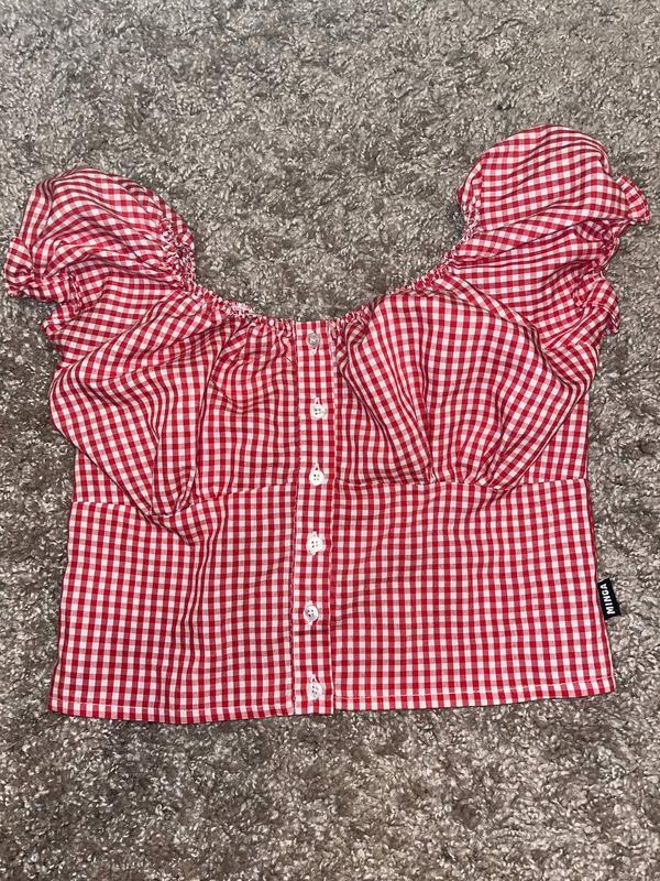 🍒🤍Картатий топ/майка/блуза/блузка червоно-біла з обʼємними рукавами-ліхтариками, чудовий на літо • Розмір M • 100% бавовна • Стан ідеальний • Бренд - Minga London