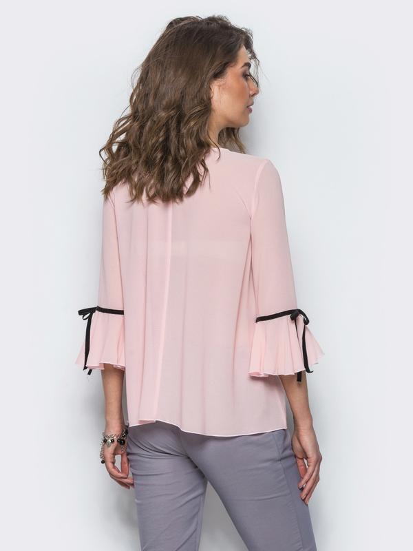 Стильна блузка з креп-шифону, з подовженням по спинці. Модель з круглою горловиною і рукавами¾. Рукава з воланами по низу, доповнені контрастною оксамитовою стрічкою. Виріб без застібок. Розмір тільки 42-44. Заміри вироби в розмірі 44: довжина по спинці – 65 см; довжина по поличці – 53 см; довжина рукава від плечового шва – 44 див. Матеріал: Креп-шифон Склад: 100% поліестер Ціна розпродажу 290грн.