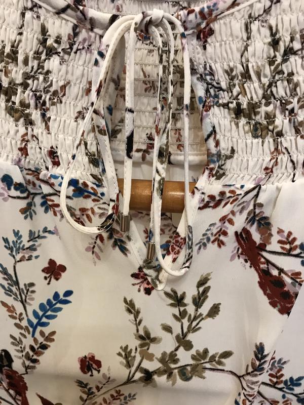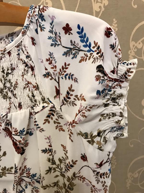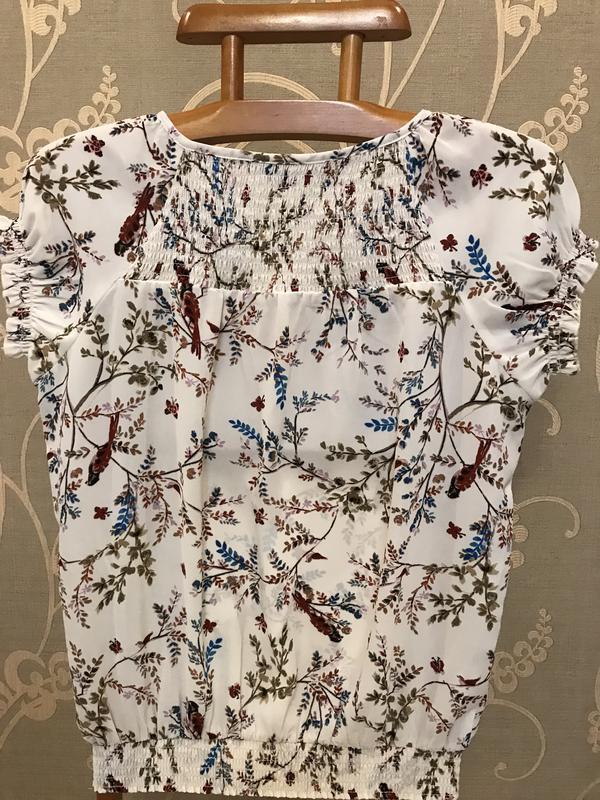Пропоную вашій увазі нереальної краси брендовий блузку світлого кольору в різнобарвних квітах, метеликів і птахів..дуже круто виглядає. Фірма DOROTHY PERKINS. Розмір вказаний 12. Склад: 100% полиестер. Нова. ПОГ-52, довжина-63, довжина рукава від шиї-20, по низу гумка..максимум тягнеться до 53. УВАГА!!! При купівлі три і більше моїх речей-безкоштовна доставка посилки Новою поштою. Вдалих покупок:)