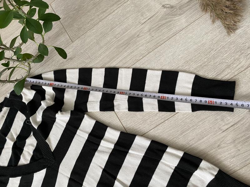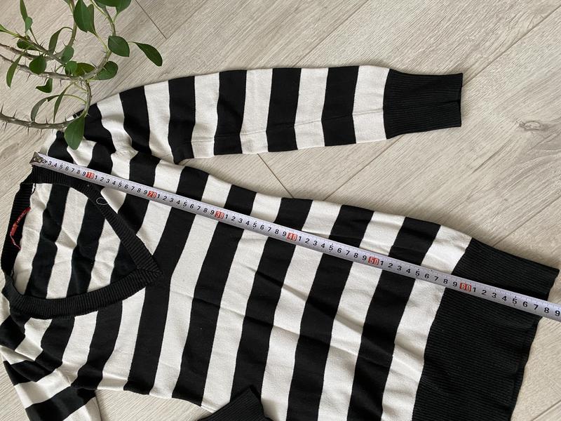 На тілі немає)виміри на фото)тягуча, рукава довгі,виріз v-подібний,на рукавах манжети в рубчик,приталені внизу манжета середньої ширини в рубчик)широка смужка) Одяг в смужку знову на гребені модної хвилі. Дізнайся, як правильно поєднувати її. У цьому сезоні різнокаліберна смужка в одязі буде у великій моді. Найчастіше, смужку приписують до чисто морської круїзної тематики, але це далеко не так. Сьогодні модно носити саме різноманітну смужку: горизонтальну і вертикальну, монохромний і діагональну, дрібну і середню, чорно-білу та кольорову. Як ми бачимо, модна смужка може бути абсолютно різноманітним. Тут головним фактор — чи подобається вона тобі, а також підходить вона до твоєї фігури.
