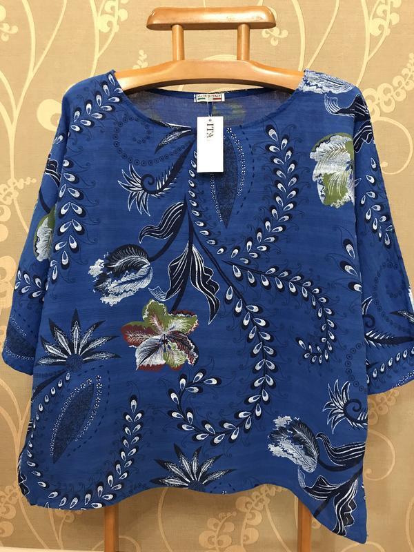 Пропоную вашій увазі нереально красиву і стильну котоновую італійську блузку синього кольору у різнобарвних квітах (в живу виглядає набагато цікавіше). Фірма ITALY. Розмір не вказаний..за вимірами йде на 18-20. Склад: 100% коттон. Нова. ПОГ-67, довжина-70, довжина рукава від ворота-52, ширина по низу-66. УВАГА!!! При купівлі три і більше моїх речей-безкоштовна доставка посилки Новою поштою. Вдалих покупок.