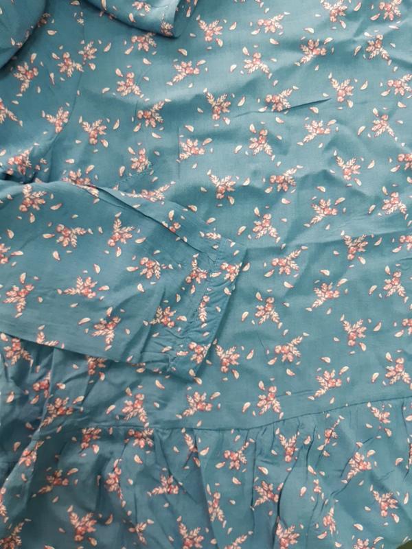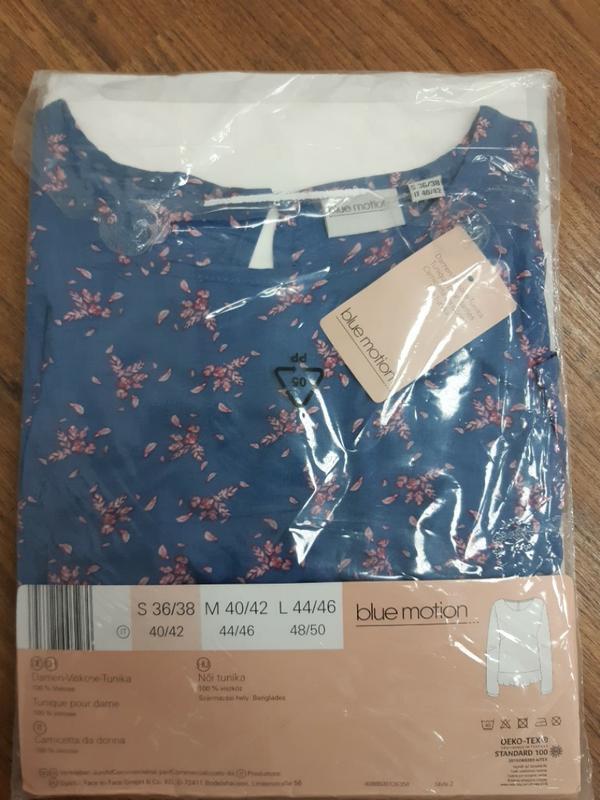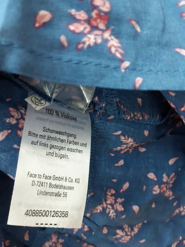 Блуза в квітковий принт з віскози Blue Motion, Німеччина. Колір - синій в модний квітковий принт. Реальний відтінок на фото 2. Прямий крій. Внизу рюш. Рукава на манжетах. На грудях виточки. фЗастегивается на спинці на гудзик. Тканина тонка, м'яка. Не тягнеться!! 100% віскоза Розмір вказаний S 36/38. Заміри: плечі 40см пог 48см довжина 56см рукав 56см Нова, з паперовою етикеткою і в оригінальній упаковці