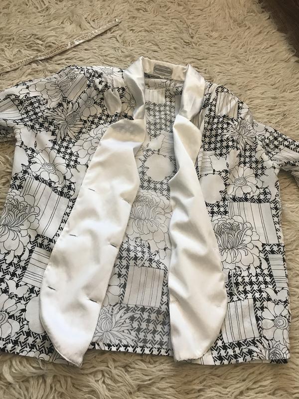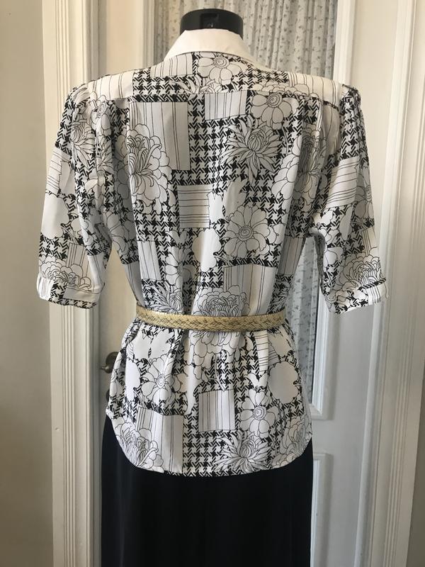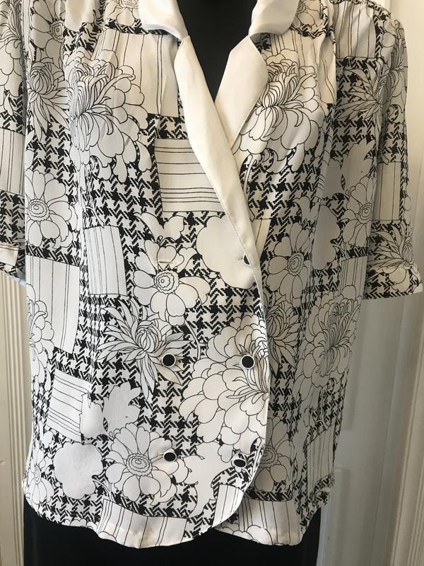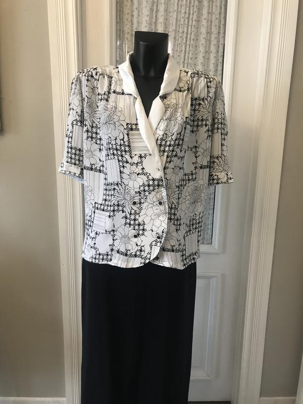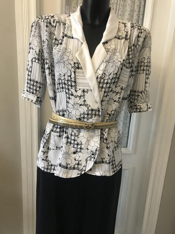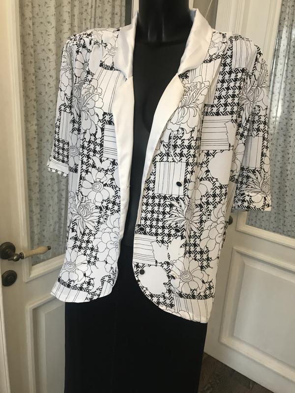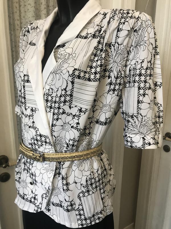 Красива вінтажна блуза:біле з чорним. За фасоном-як легкий двобортний жакетик. Склад:віскоза-100/. Розмір на бірці-42. Заміри:довжина-65 см, ПОГ-58 см, ПОБІДИ -54 див. Загублена одна ґудзик.
