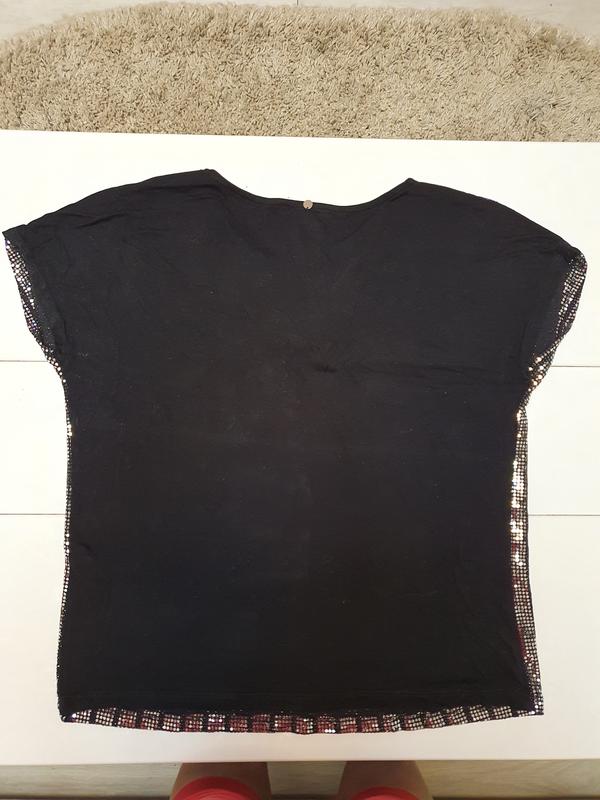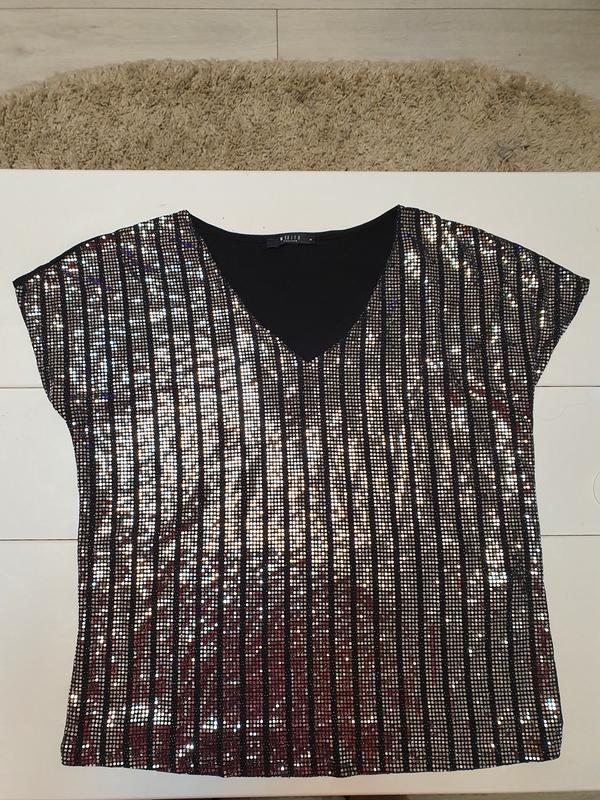 Блузка з паєтками срібного кольору, спинка - м'який трикотаж чорного кольору. Розмір М. Одягнена один раз, стан ідеальний. Бренд Mohito. Склад: верх 91% поліамід, 5% еластан, 4% метализ.волокно, низ 100 % віскоза. Заміри: ПОГ 49 см довжина 60 см ПОТ 47 ширина по низу 49 см