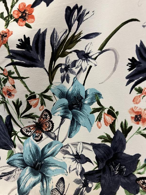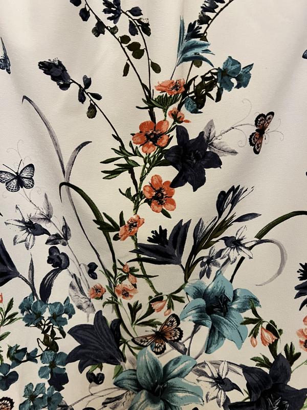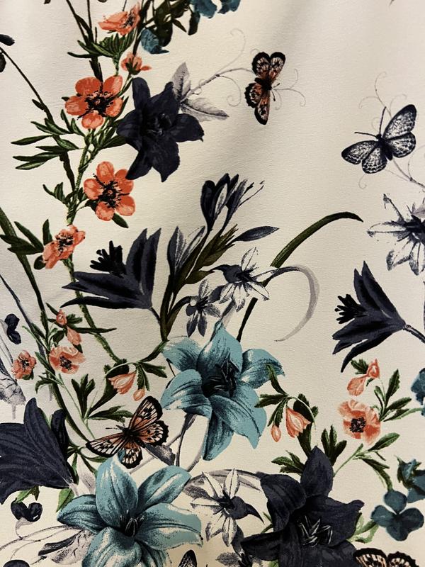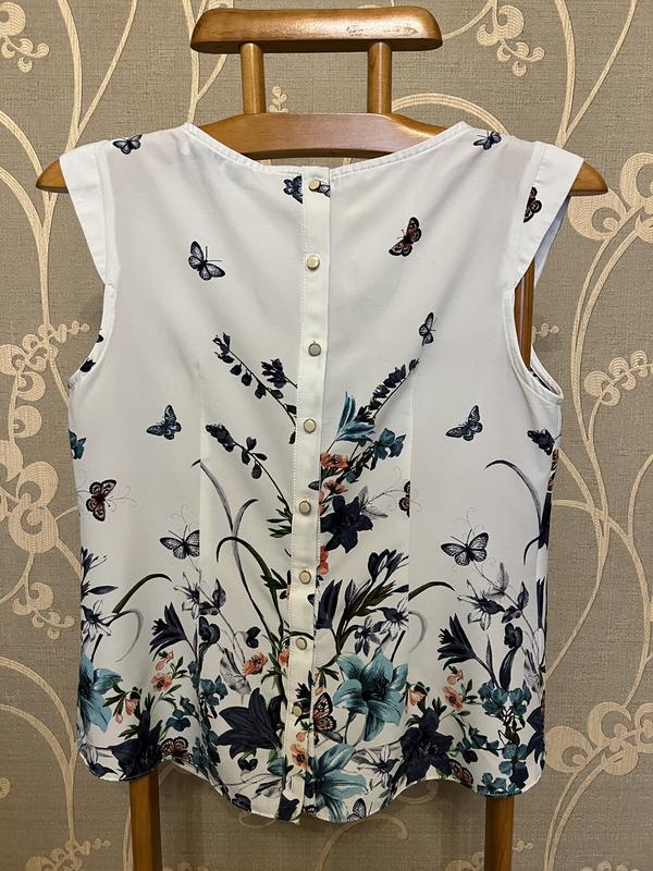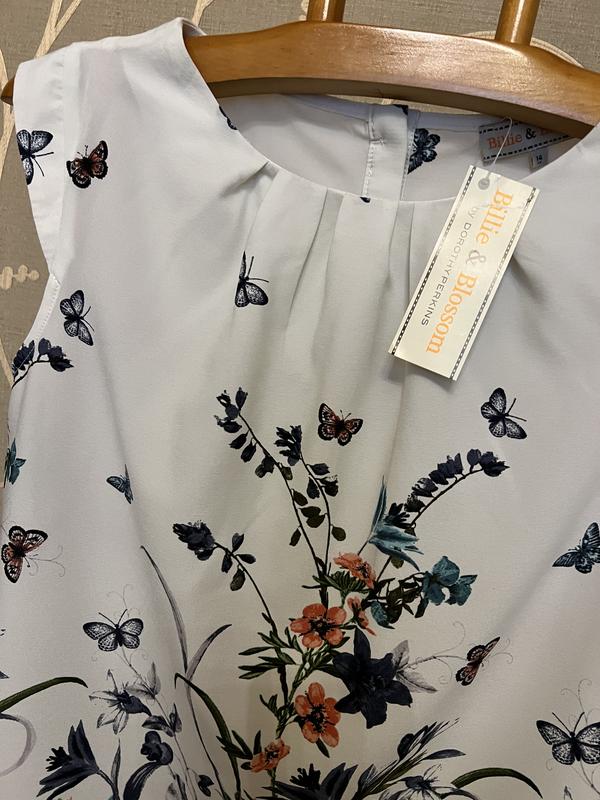 Пропоную вашій увазі дуже красиву і стильну брендовий блузку в різнобарвних квітах і метеликах, спинка повністю застібається на ґудзики (в живу виглядає набагато цікавіше). Фірма Billie&Blossom від DOROTHY PERKINS. Розмір вказано 14US10..за вимірами йде на 10. Склад: 100% поліестер, тканина трохи тягнеться. Нова. ПОГ-50, довжина-60, плечі-38, ширина по низу-52. УВАГА!!! При купівлі три і більше моїх речей-безкоштовна доставка посилки Новою поштою. Вдалих покупок.