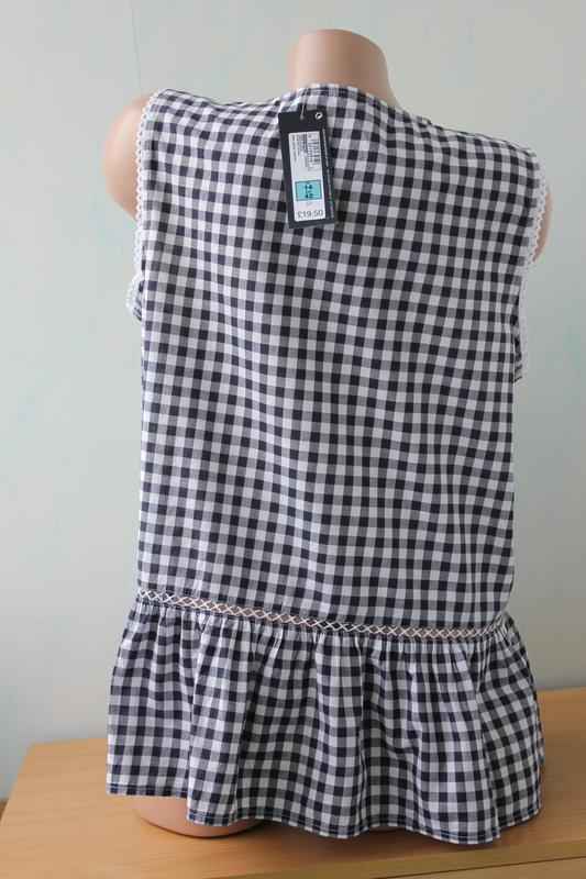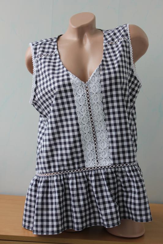 Легка, натуральна блуза в клітку , попереду прикрашена мереживом, приємна до тіла, поєднується з будь-яким низом, на бирці 14 розмір, на нього і йде. пог - 54, довжина по спинці - 66 см, не трикотаж, дуже приємна Склад: 100% бавовна
