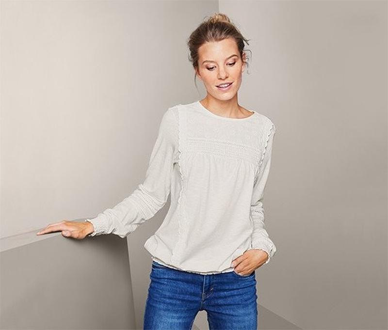 Ця сорочка-кофточка з круглим вирізом набирає очки завдяки своїй візуальної легкості, а також м'якої струмує бавовняно-модальної суміші, що робить її приємно легкої у верхній частині тіла. Жіноча сорочка має витончену вишивку з чистої бавовни спереду і в районі ліктя, що забезпечує грайливий, романтичний вигляд. Широкий еластичний пояс на подолі і манжетах забезпечує зручне прилягання.
