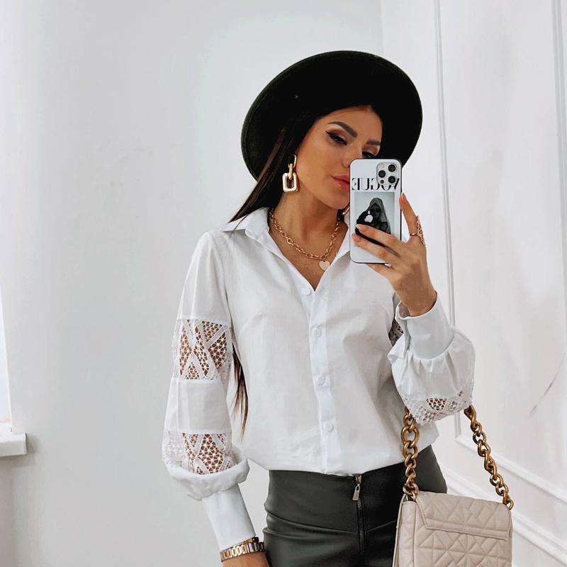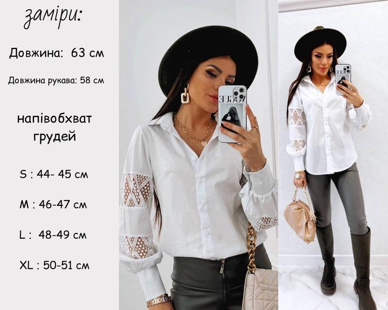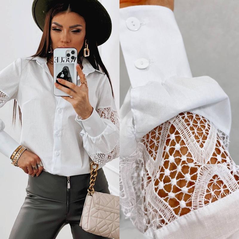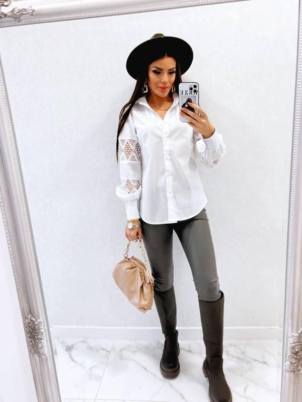 Опис: Оригінальна сорочка з 100% котону на ґудзиках із класичним коміром та довгими рукавами, декорованими мереживними ажурними вставками.