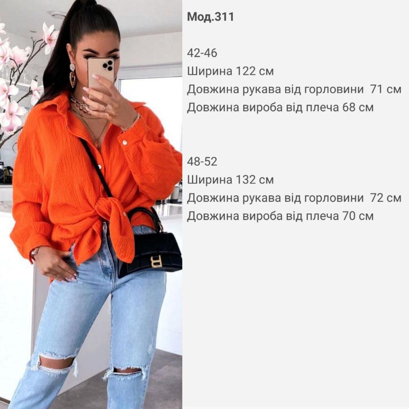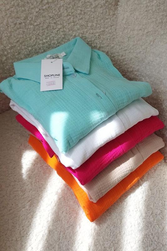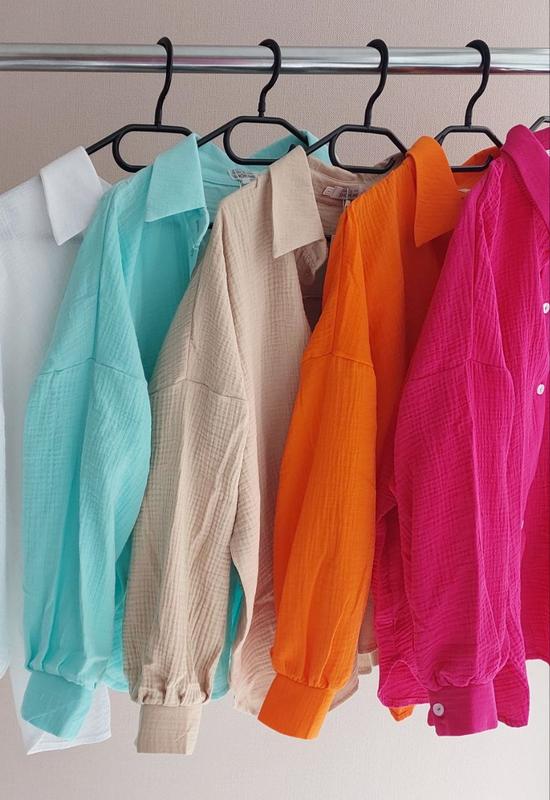 Літня сорочка з натуральної тканини муслін. Фасон вільний, спущений рукав, вирізи по бокам, рукава на манжеті, застібка на ґудзики.