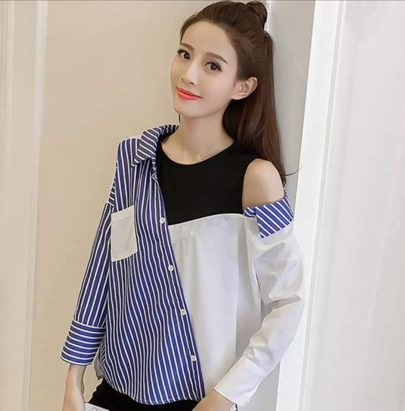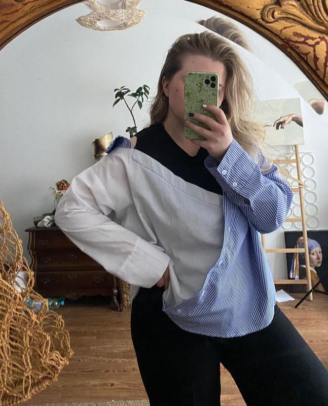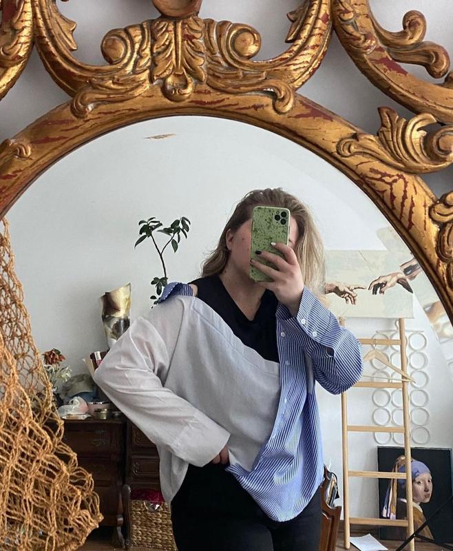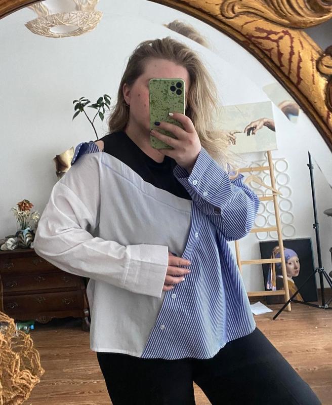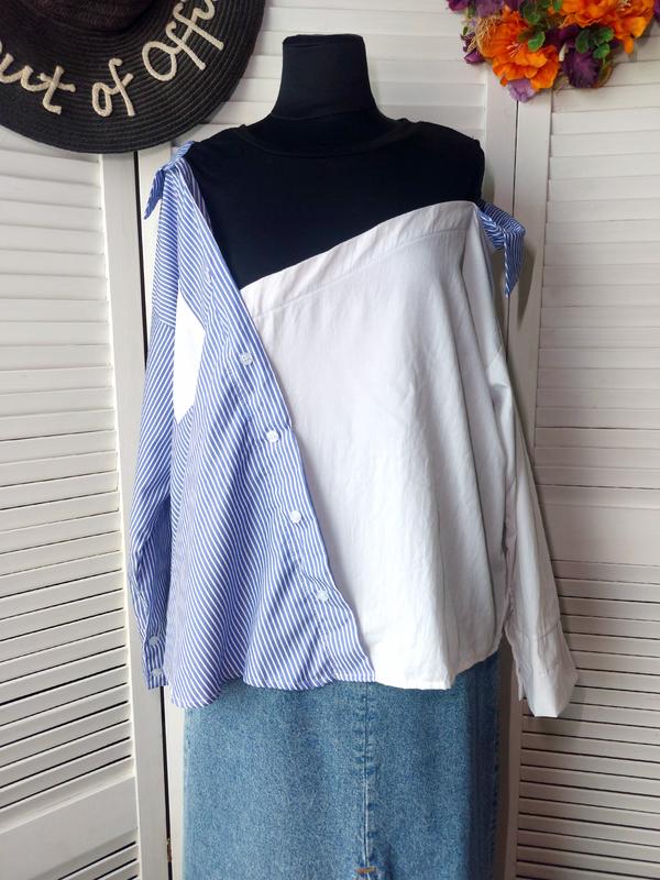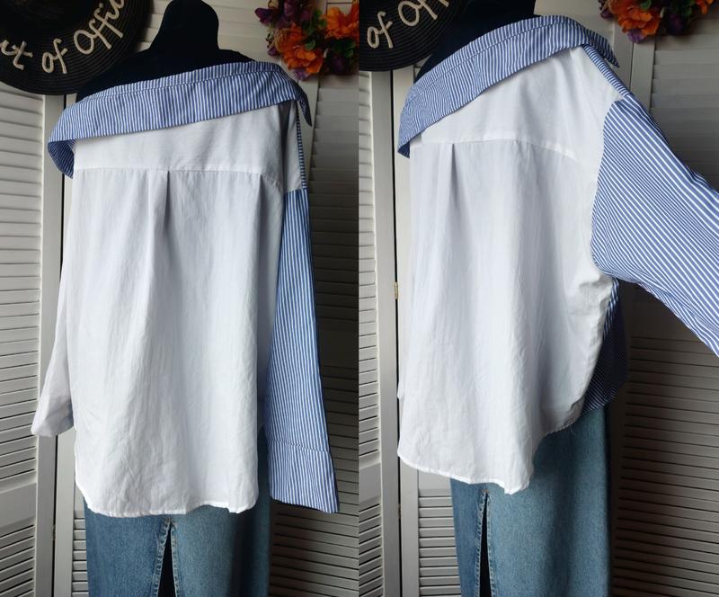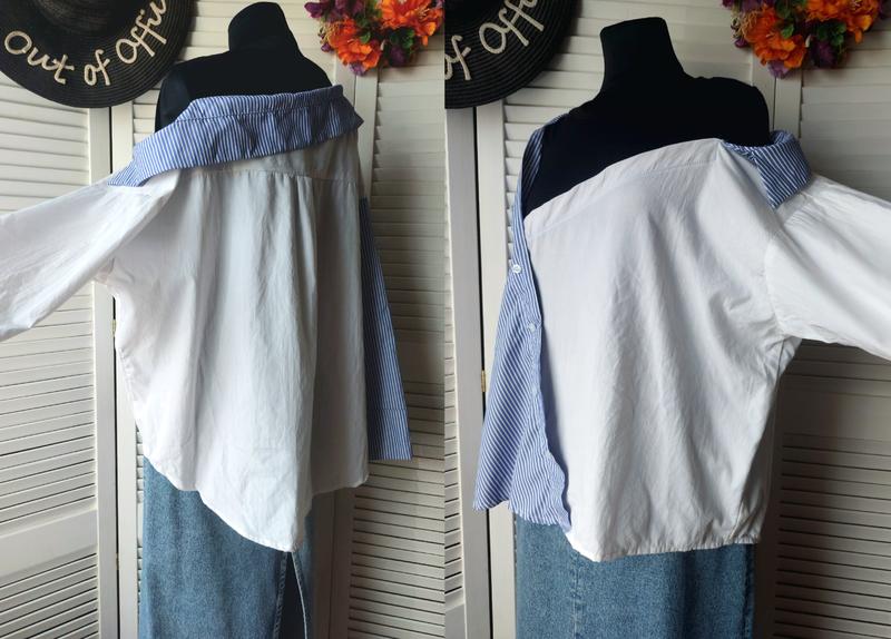 Асиметрична сорочка оверсайз біла/синя в смужку з приспущеним плечем.