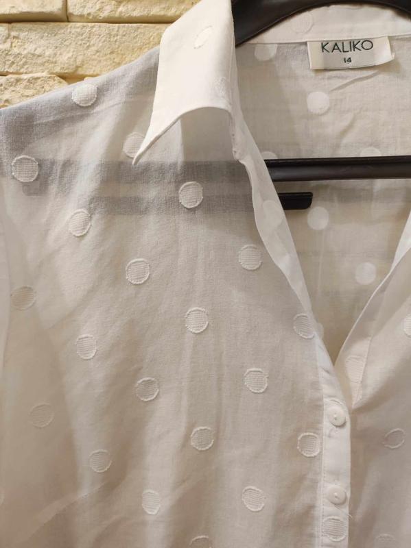 Чудова блуза / сорочка Kaliko, тонкий,трошки прозорий котон в однотонний горошок, рукав 3/4 ,стан ідеальний, без дефектів, Заміри: ПОГ 50 см, довжина по спинці 57 см,плечі 40 см.
