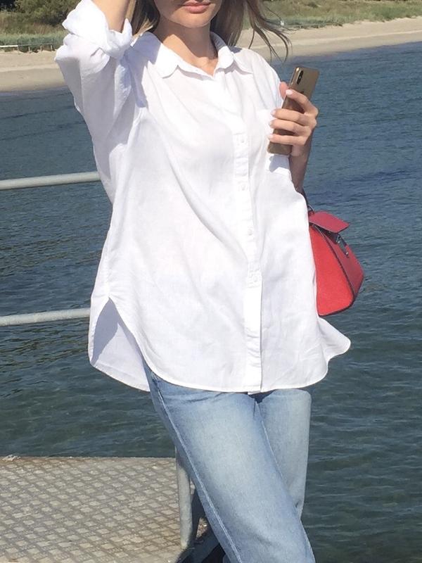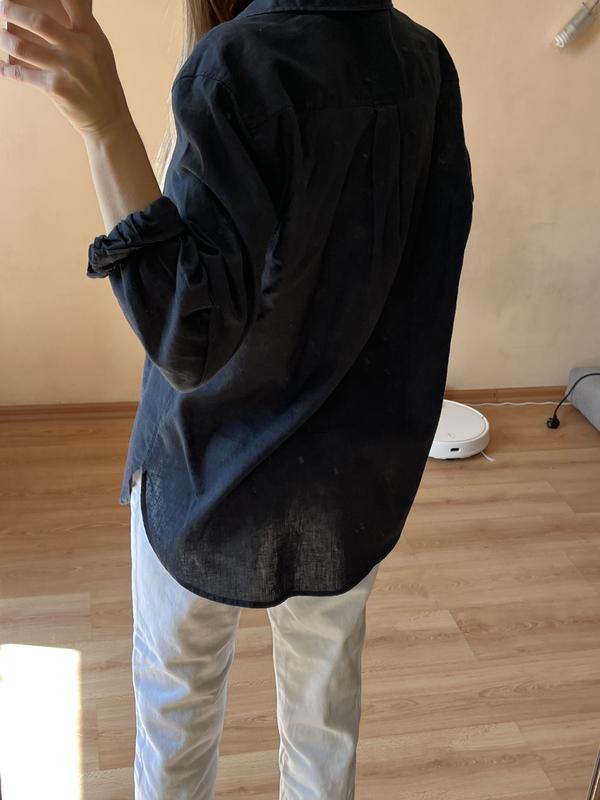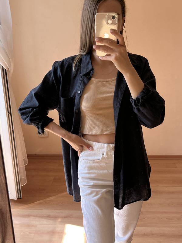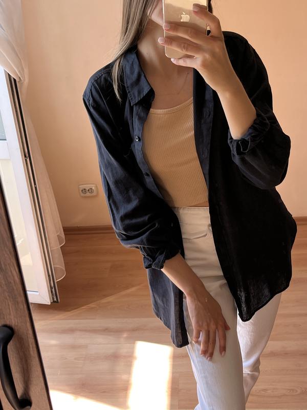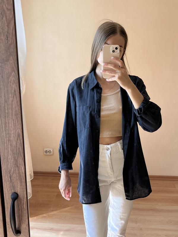 Лляна рубашка H&M у відмінному стані.Є біла та чорна. Розмір: S, оверсайз модель, має бути і на МСклад: льон 52%, бавовна - 48%По плечам: 42 смНОГ: 52 смДовжина: 69 см