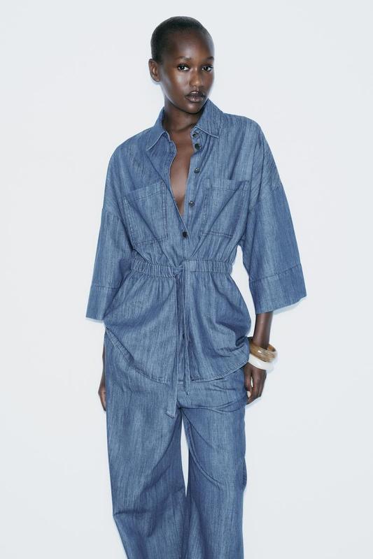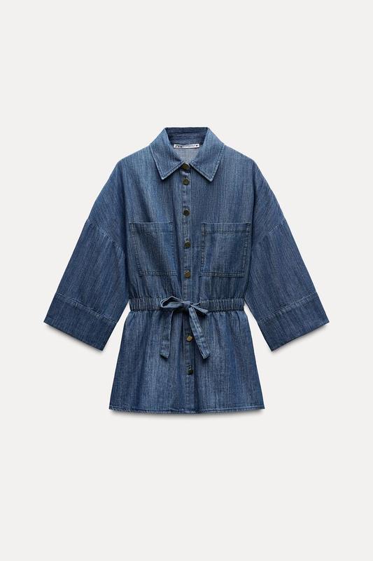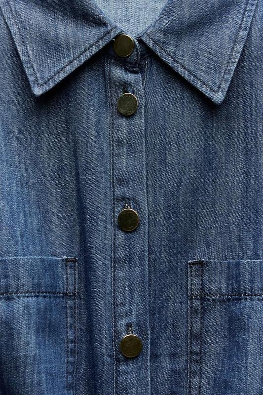 Сорочка з коміром-сорочкою та рукавами нижче ліктя. Накладні кишені на грудях, гумка на поясі із зав'язками з тієї ж тканини та металеві ґудзики спереду.
