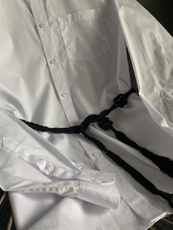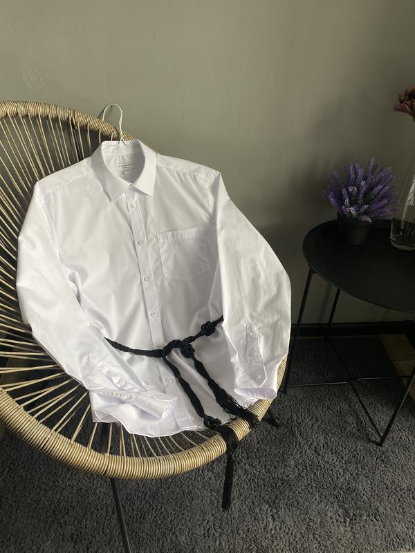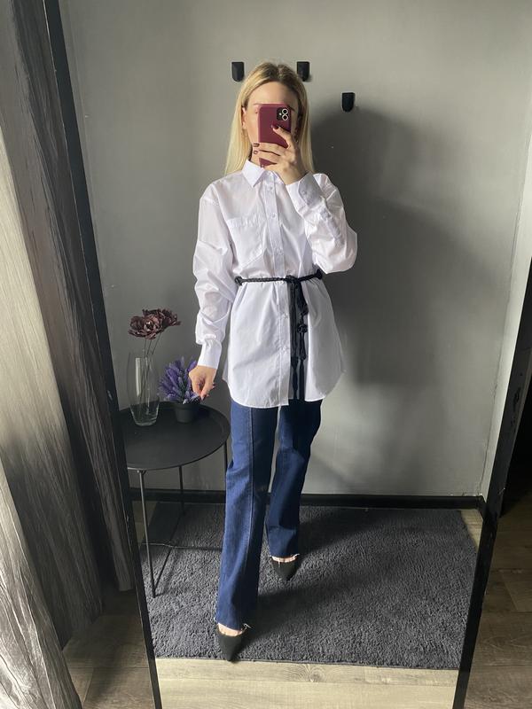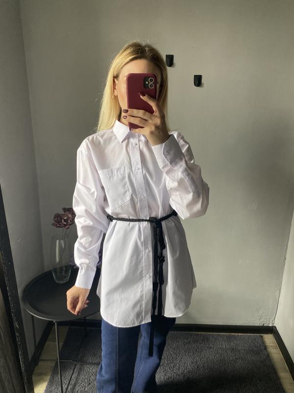 Білосніжна оверсайз-сорочка (поліестр та котон). З нагрудним карманчиком. В комплекті з плетеним паском.
