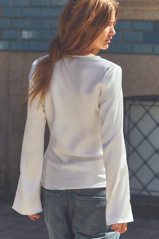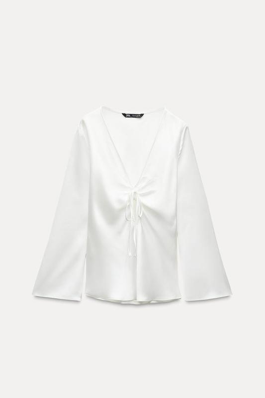 Сорочка з V-подібним вирізом, довгими розкльошені рукавами, вирізом спереду, зав'язками з тієї ж тканини та прихованою блискавкою збоку.Білий | 4764/140
