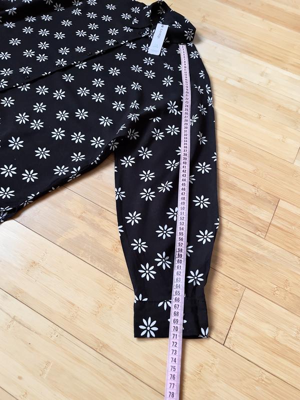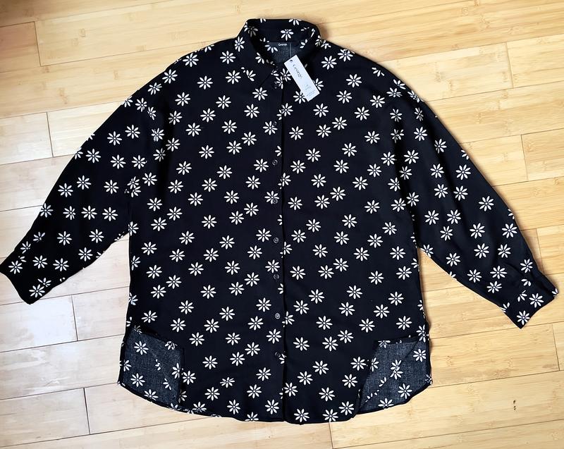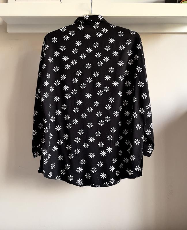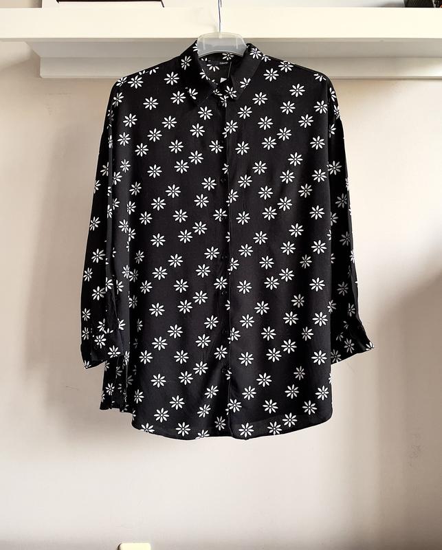 Натуральна чорна сорочка-оверсайз в ромашки,з опущеними плечима,проста і стильна,відмінної якості та крою.Заміри дивіться на фото.