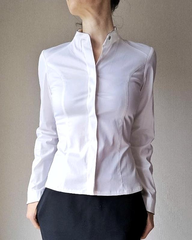 Сорочка біла жіноча біла, приталена, із суцільнокроєним коміром-стійкою, манжети декоровані металевими гудзиками. Розмір xs, український 42. Параметри моделі на фото: зріст 1,70 м, обхват грудей 84,00 см, обхват талії 64,00 см, обхват стегон 92,00 см. Гарно сяде на менші параметри. Тканина - стнейчевий котон середньої щільності.