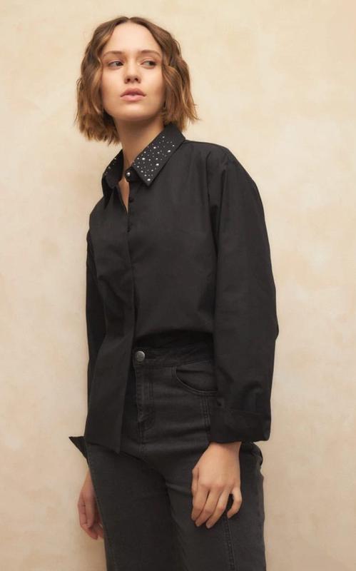 Чорна базова сорочка з круглими шипами на комірі. Трохи приталена. На рукавах ґудзики для підкату. Склад: 100% бавовна. Закриті шви, дуже якісний пошив. Колір насичений чорний. Без нюансів і дефектів, стан нової речі.