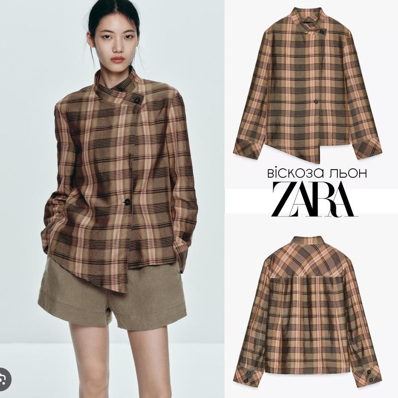 Zara верхня асиметрична сорочка з льоном zw collection оверсайз в клітинку
