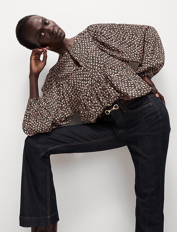 Ця блузка із яскравим квітковим принтом створює ефектний образ. Прямий крій, елегантні рукави-ліхтарики та акуратний круглий виріз горловини. Застібка на гудзики спереду створює класичний образ.
