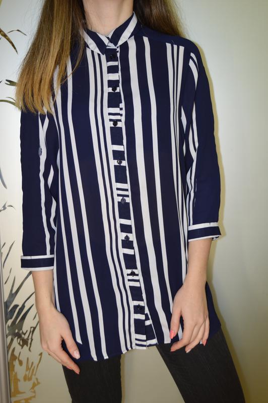 Сорочка в смужку прямого крою, довга . Можна носити як туніку. Рукав 3/4 Стан ідеальний Розмір 8/36/S ПРО : 85-90 ВІД : до 80 Довжина 69; ззаду 73; довжина рукава 42.