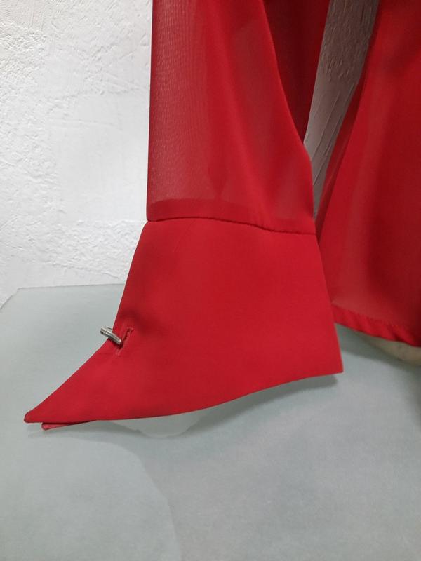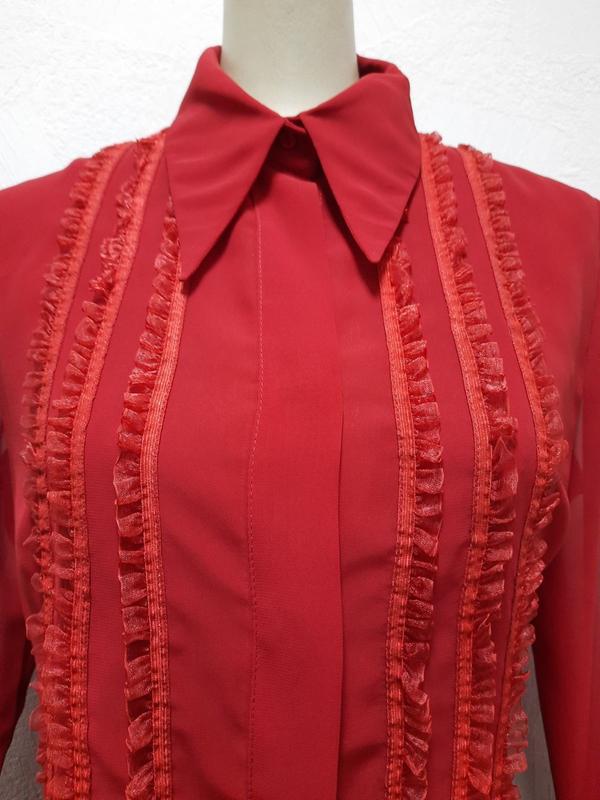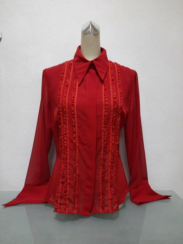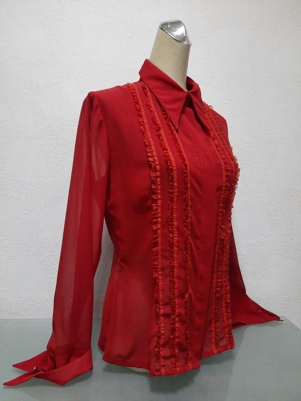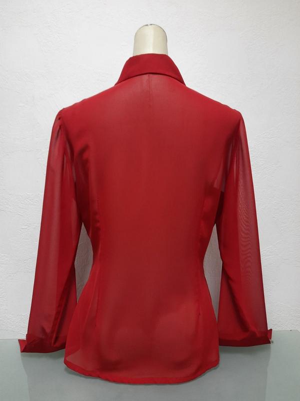 Модель классическая женская блуза с длинным рукавом с манжетом, натуральный шелк полупрозрачный, воротник рубашечный. Дополнительно блуза украшена складочками.