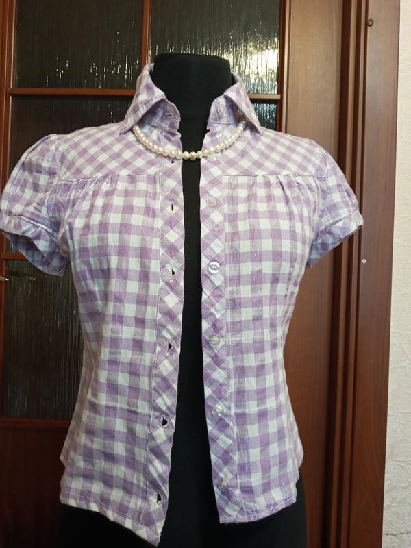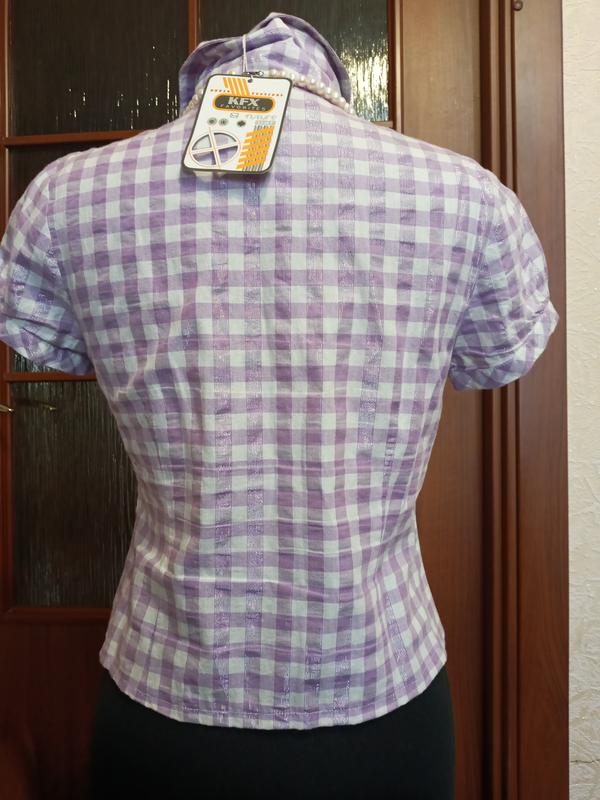 сорочечка,нова,кольору ніжна бузок ,з сріблястою ниткою,клітина,бузок і біла,без підкладки,застегаеться спереду на гудзики,короткий рукавчик,ліхтарик,стильна,модна,комфортна,бренд,КИТАЙ ПОГ - 46 ПОТ - 40 ПОБІДИ - 44 ДІ - 49 Д рукавчика - 9 Без нюансів,повернення немає,оплата на карту!