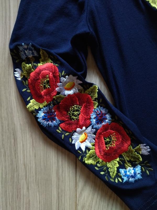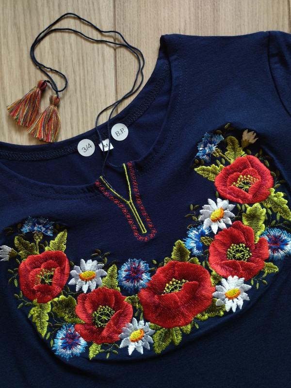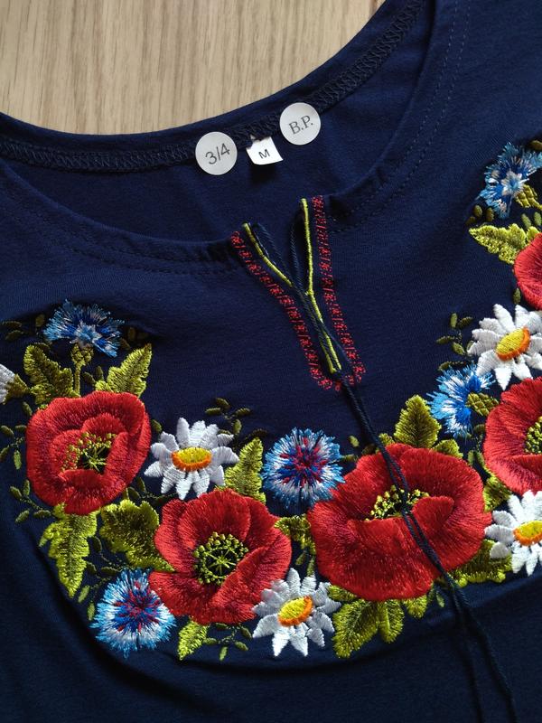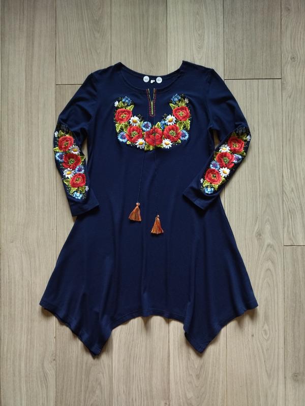 Трикотажні туніки, нові, без етикеток, асиметричного крою, рукав 3/4, колір темно-синій з яскравою вишивкою. Тканина не щільна, тягнеться, склад на жаль, не вказано. Розмір на бірці М, може маломірити.
