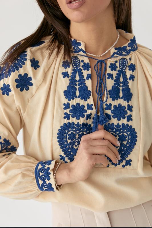 Модель йде з прямим низом. Кругла горловина обшита коротким коміром і спереду доповнена вишитою кокеткою із зав'язками зверху. Довгі рукави внизу обшиті вузькими манжетами, які застібаються на ґудзичок.
