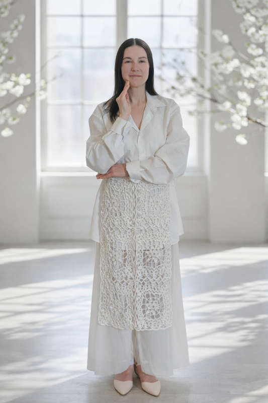 Фартух здавна був важливою частиною українського жіночого вбрання- не лише побутовою річчю, а й сакральним елементом, що має оберегову функцію. Квадрат - символ благополуччя, миру, достатку. Фартушки як адаптований український одяг повертаються в культурний простір не як музейний експонат, а як жива форма самовираження. Можна одягнути як повсякденний аксесуар з джинсами, або як святковий - з шовковою сукнею. 100% льон 100% ручна робота, в техніці гачкування 39*60 см Делікатне ручне прання Сушити природньо